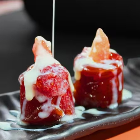 Enroladinho de goiabada, recheado com cream cheese, finalizado com morango, leite condensado e raspas de limão.