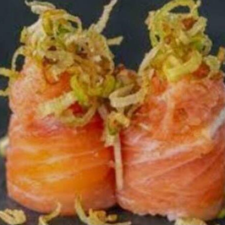 Delicioso enrolado de alga Nori, arroz Shari, empanado em farinha panko e frito em óleo de algodão, recheado com cream cheese, salmão fresco batidinho com cebolinhagrelhado em cubos, finalizado com um delicioso molho tarê da casa, gergelim e cebolinha