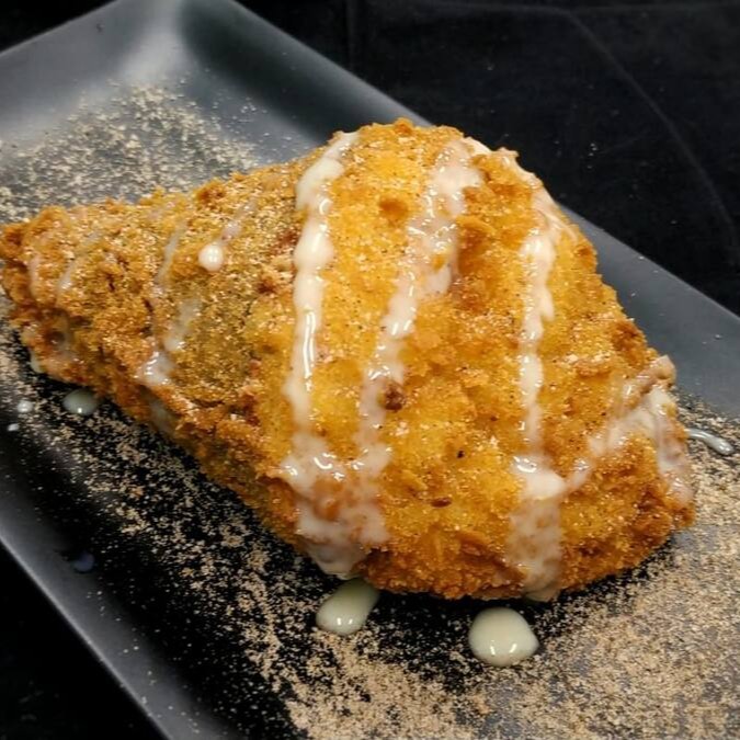 O nosso delicioso Supah Yaki Temaki, na versão Doce: Grande, bem recheado, crocante, empanado em farinha Panko e Frito por imersão em óleo de algodão, finalizado com uma pitada de Mix de Açúcar e Canela e Leite Condensado Vegano Soymilk.