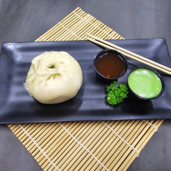 Pão Chinês de massa leve, cozido no vapor, recheado com refogado de Proteína Texturizada de Soja, Acelga, Cenoura, Gengibre e Sal.