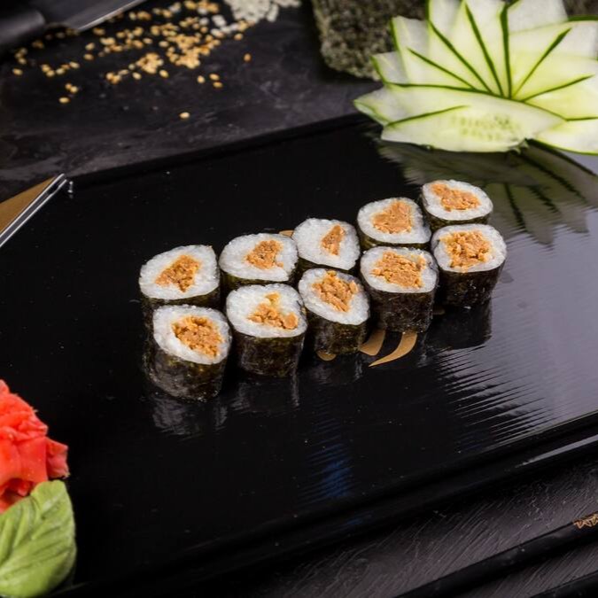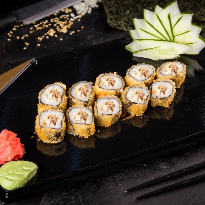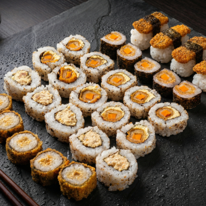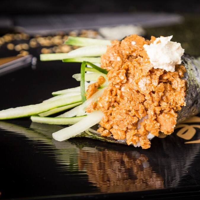 Enrolado em Nori (Alga) com Shari (Arroz japonês temperado com molho Su), empanado em Panko, frito por imersão e recheado Patê de Atum da Fazenda Futuro e nosso Cream Cheese Vegano.