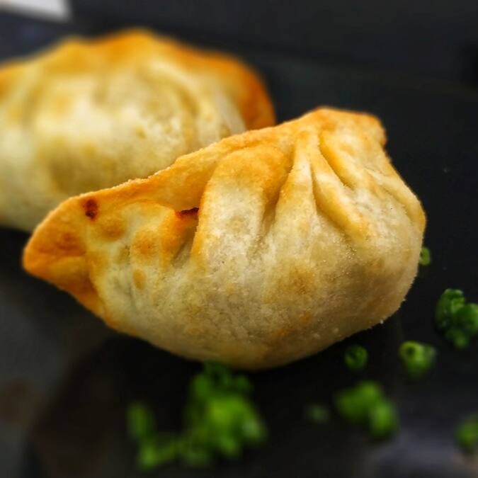 Nosso Guioza Vegano frito por imersão, feito a mão, recheado de Proteína de Soja, Acelga, Cenoura, Ciboullet, Gengibre, todos refogados e temperados com sal.