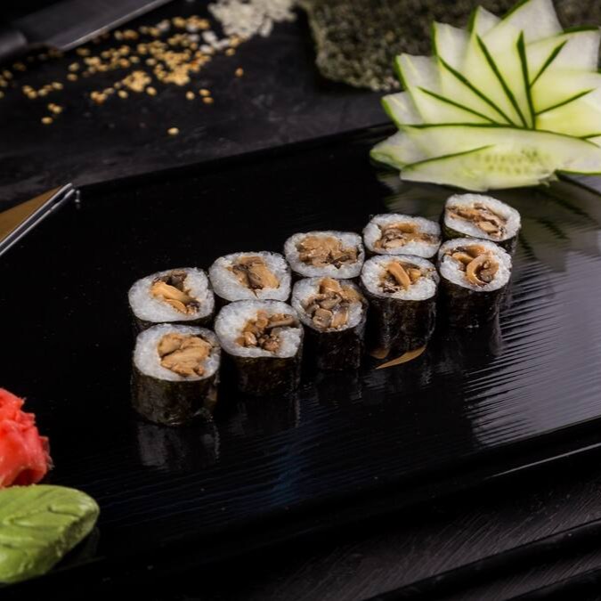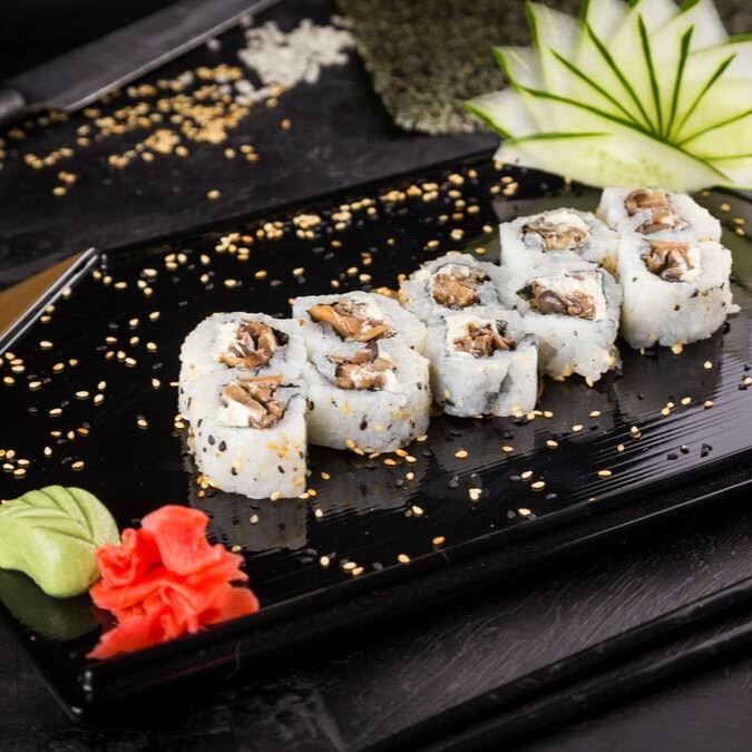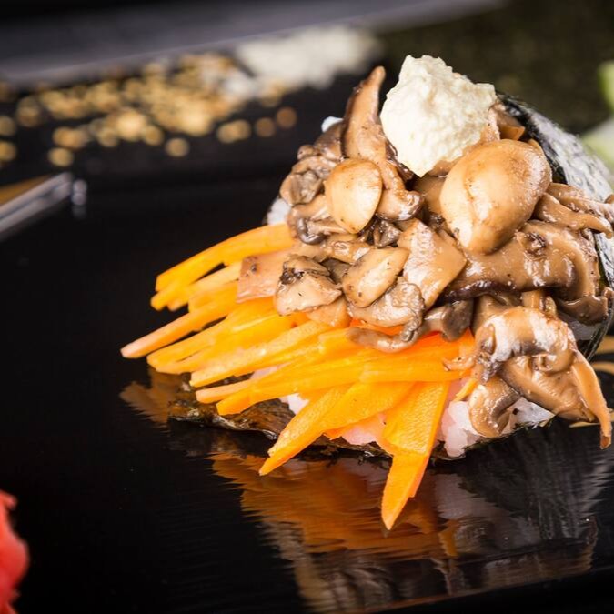 Enrolado em Nori (Alga) de Shari (arroz japonês com molho Su) recheado de Mix de Cogumelo, Cenoura marinada em Molho Oriental Salt-Sour e Cream Cheese Vegano.