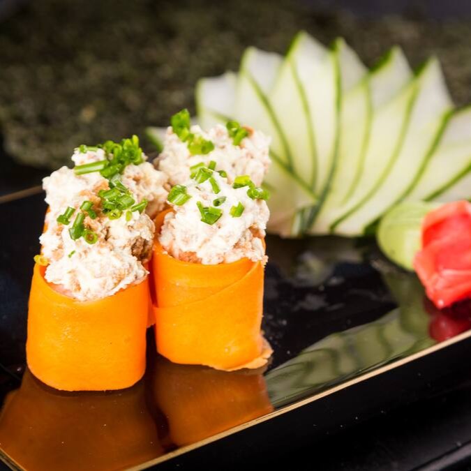 Bolinha de Shari (Arroz japonês com molho Su) enrolada por fatia de Cenoura marinada em Molho Oriental Salt-Sour, coberta com Patê de Atum da Fazenda Futuro e Cream Cheese Vegano guarnecida de Cebolinha Francesa Hidropônica.