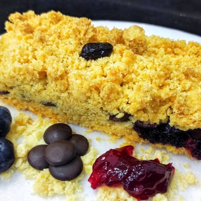 Crumble De Mirtilo Com Chocolate Meio Amargo Farofinha com trigo, recheio de geleia de frutas vermelhas com toque ácido, mirtilos frescos e pedacinhos de chocolate vegano meio amargo.Crocante por fora, surpreendente por dentro.Equilíbrio perfeito entre o doce e o ácido.