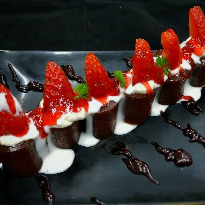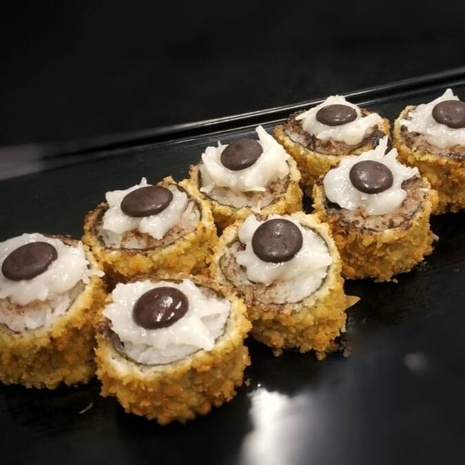 Enrolado em Nori (Alga) com Shari (Arroz japonês temperado com molho Su), empanado em Panko, frito por imersão e recheado do nosso exclusivo chocolate a base de cacau preto (aquele que faz óreo ;) com creme de coco, finalizado com Mais creme de coco e uma pepita de chocolate.