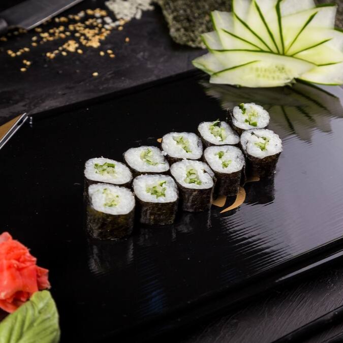 Enrolado em Nori (Alga) com Shari (Arroz japonês temperado com molho Su) e Pepino Japonês fatiado.
