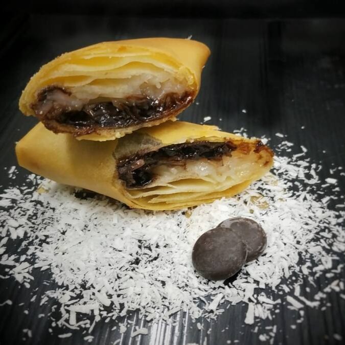 Deliciosa massa fininha de trigo, enrolada e rechada de Chocolate feito com Cacau Black (cacau de fermentação longa, o mesmo da Oreo ;) + Creme de Coco, fritos sob imersão em óleo de algodão.