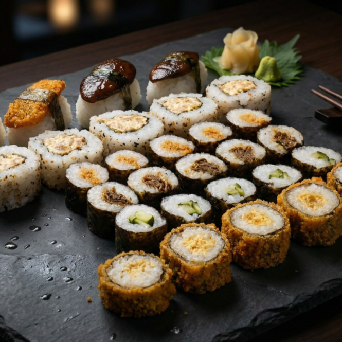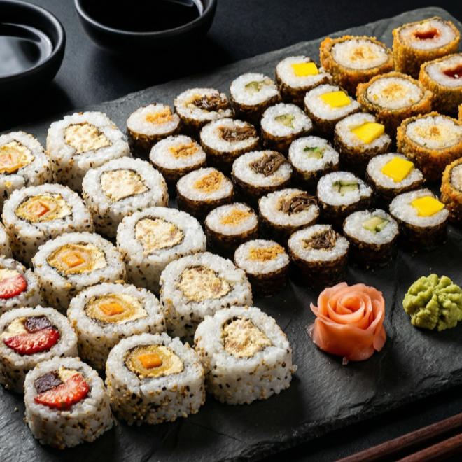 5 Uramaki Filadélfia, 5 Hossomaki Manga, 5 Uramaki Carrot Skin, 5 Uramaki Romeu e Julieta c/ Morango, 5 Hossomaki Mix de Cogumelo, 5 Hossomaki Kappa, 5 Hossomaki Atum, 5 Hot Atum Filadélfia, 5 Hot Romeu e Julieta