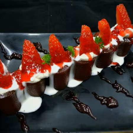 Ichigo (enrolado) de deliciosa Goiabada rechada de Cream Cheese, sob (¼) de Morangos Frescos, finalizado com Calda de Geléia de Morango e Creme de Leite Vegano Notco.