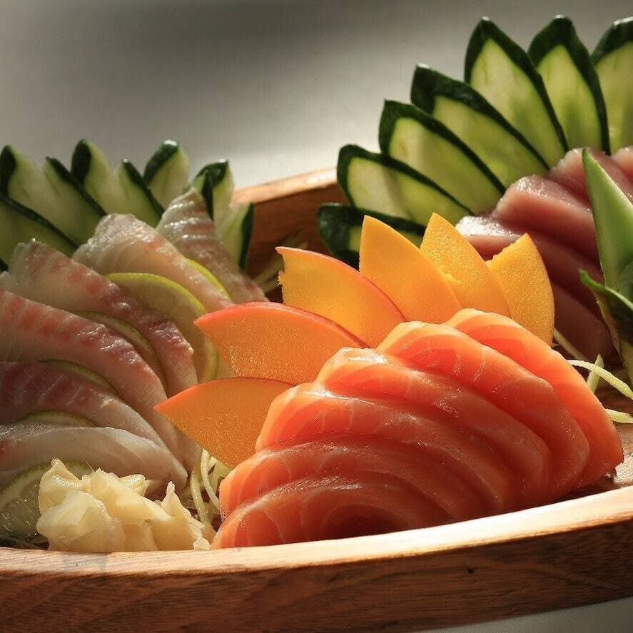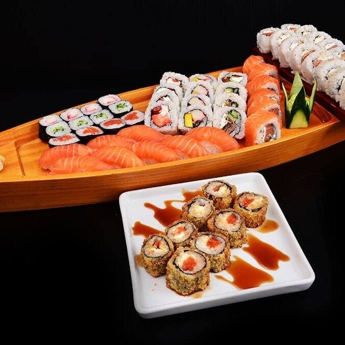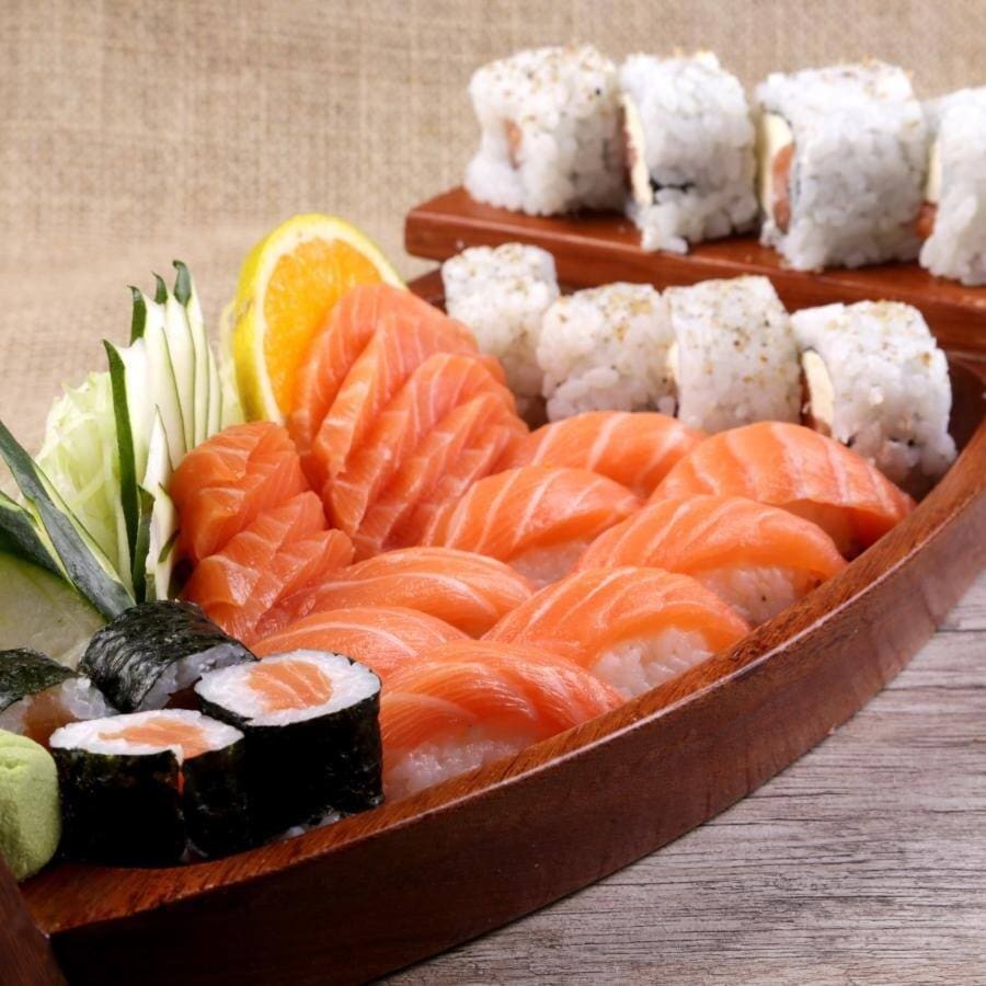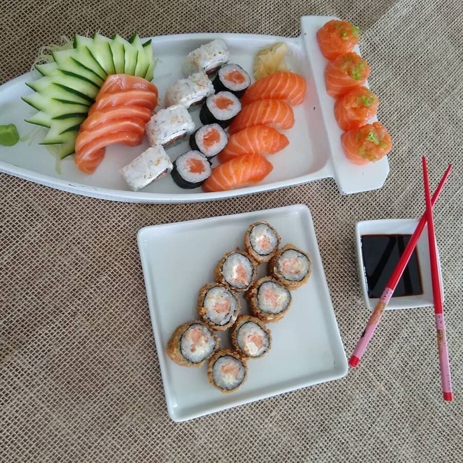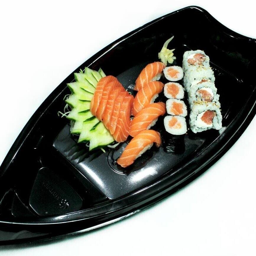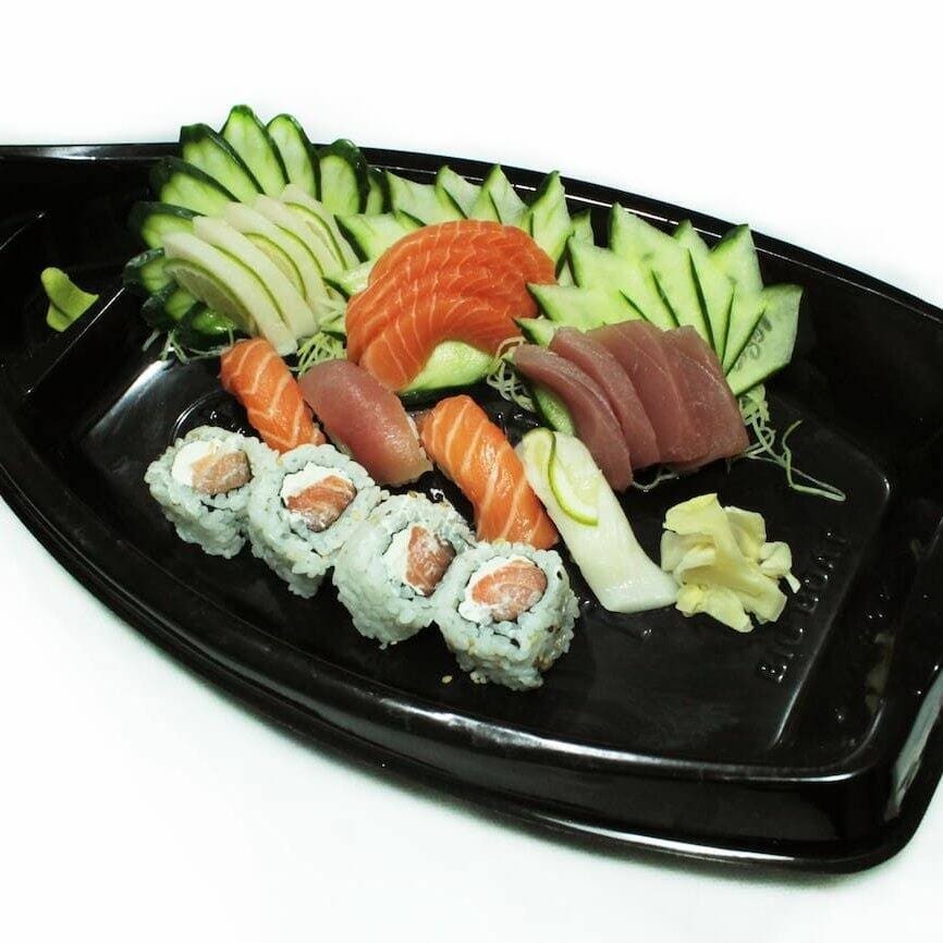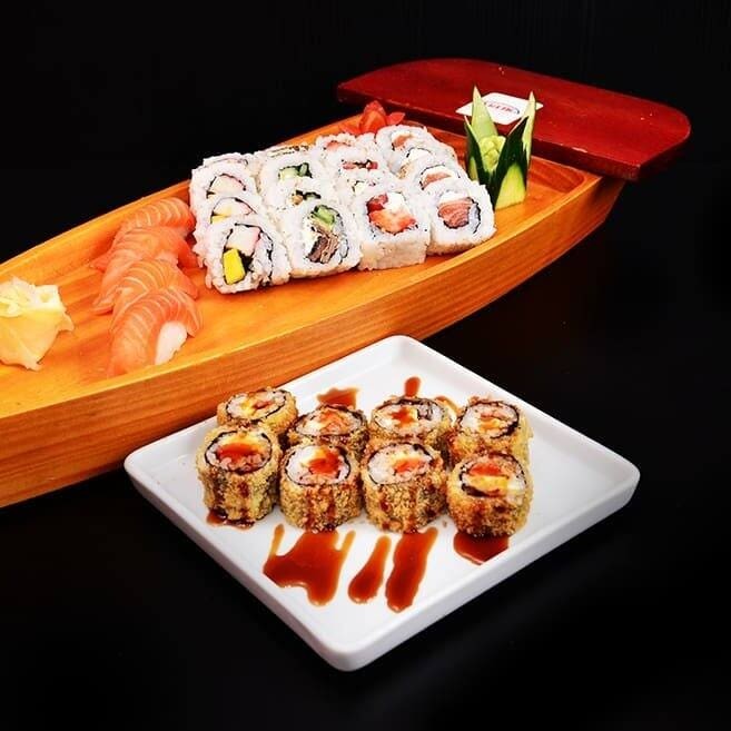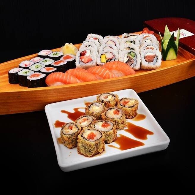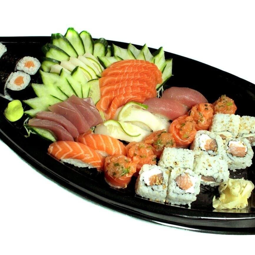 10 sashimi, atum, peixe, 4 niguiris variados e 4 uramaki filadélfia.