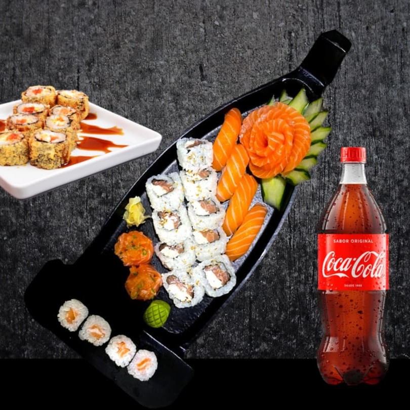 9 unid de uramaki filadelfia 8 unid de hot filadelfia 5 unid de sashimi de salmão 4 unid de saquemaki 4 unid de niguiri salmão 2 unid de sushi Joe 1 coca cola de 1 litro