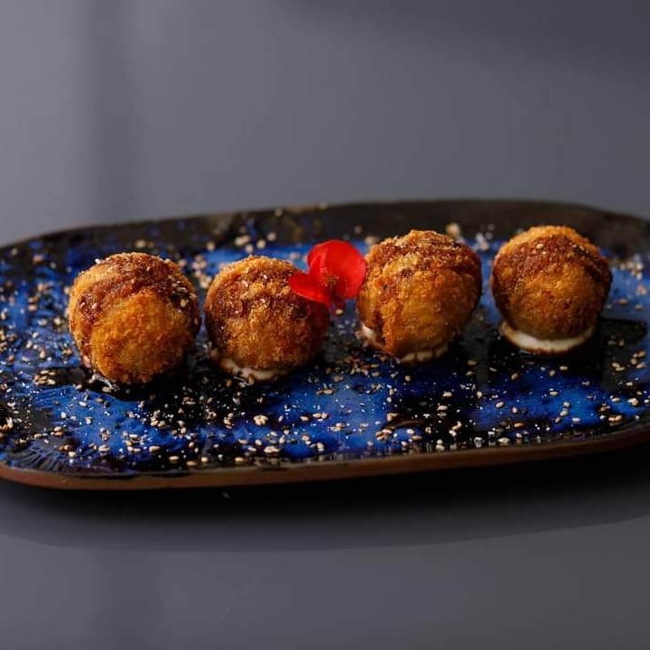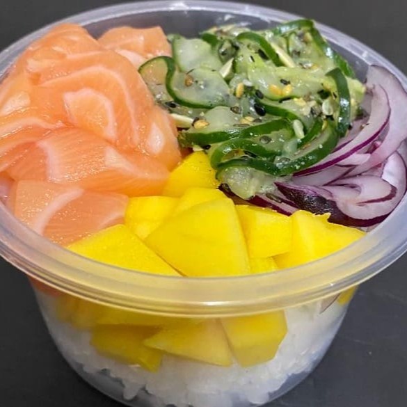 Shari, Salmão, Sunomono, Manga, Cebola Roxa, Batata Doce Crispy.