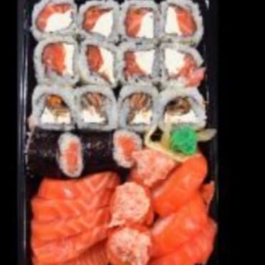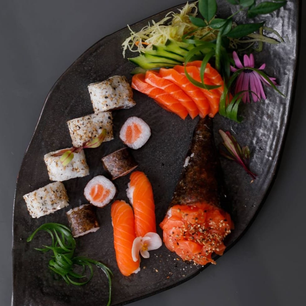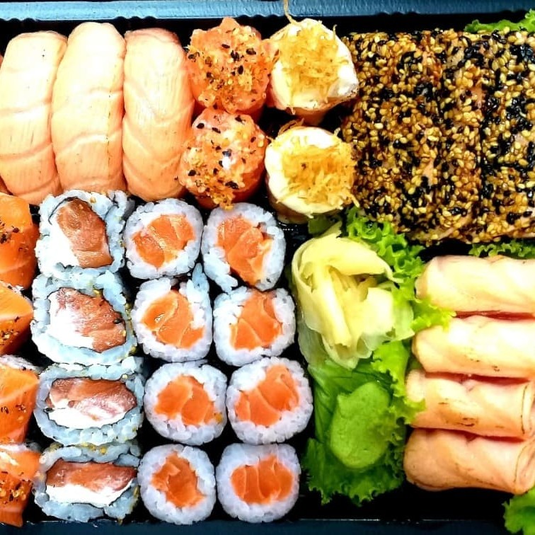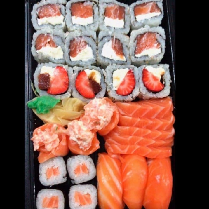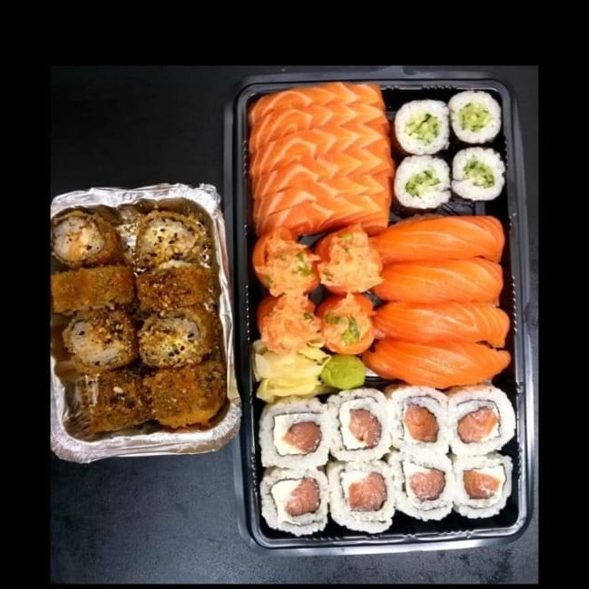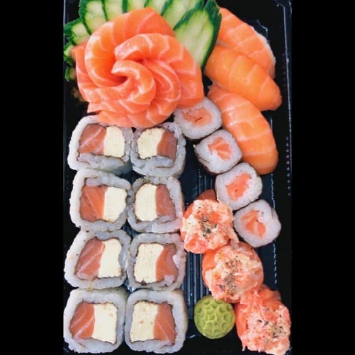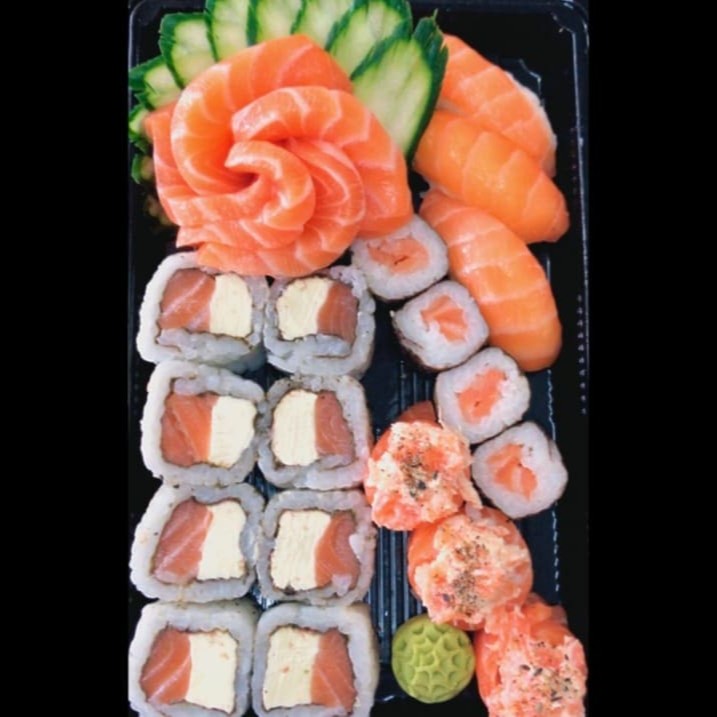 5 un. Sashimi de Salmão, 8 Un. Uramaki Filadélfia, 4 un. Hossomaki de Salmão, 3 un. Niguiri de Salmão, 3 un. Gunka Joe + 4 Un. Uramaki Skin