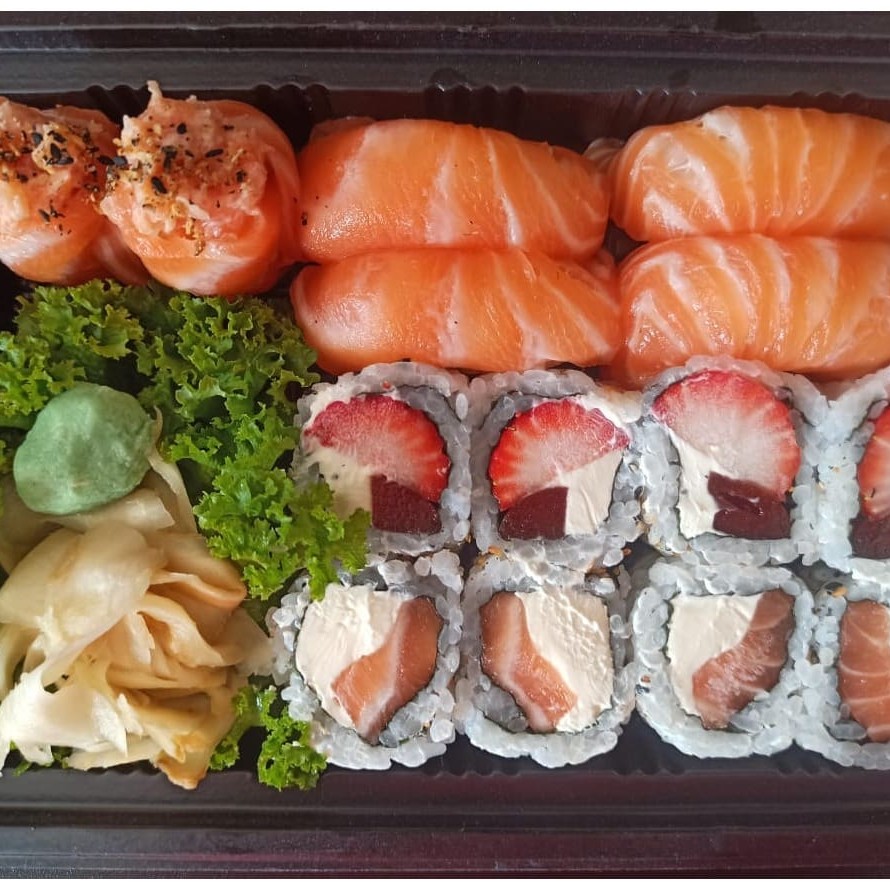 5 un. Sashimi de Salmão, 8 Un. Uramaki Filadélfia, 4 un. Hossomaki de Salmão, 3 un. Niguiri de Salmão, 3 un. Gunka Joe + 4 Un. Romeu e Julieta