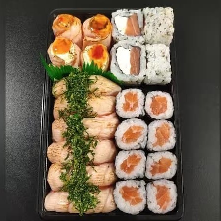 8un Sashimi de salmão 8un Uramaki Filadélfia 8un Romeu e julieta 3un Niguiri de salmão 3un Niguiri maçaricado 4un Hossomaki de salmão 4un Hossomaki de pepino 4un Hossomaki de kani 4un Uramaki skin especial 4um Futomaki califórnia 2un Gunka joe 8un Hot filadélfia