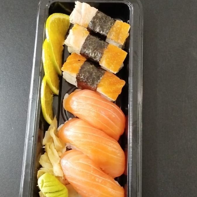 5 un. Sashimi de Salmão, 8 Un. Uramaki Filadélfia, 4 un. Hossomaki de Salmão, 3 un. Niguiri de Salmão, 3 un. Gunka Joe.
