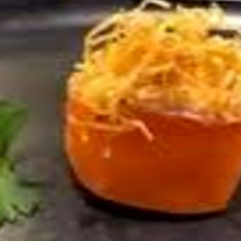 Hot Crocante recheado com pepino, Salmão, Cream-cheese, coberto com batata doce Crispy geleia de pimenta e molho tarê.