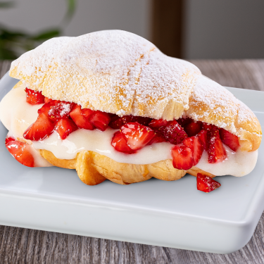 Escolha o tamanho do Croissant (pequeno ou médio), recheado com Creme de baunilha, morangos e açucar de confeiteiro