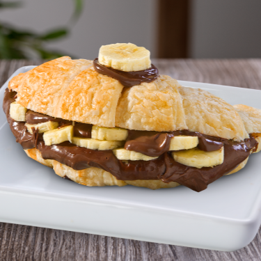 Escolha o tamanho do Croissant (pequeno ou médio), recheado com Creme de cacau e avelãs com banana