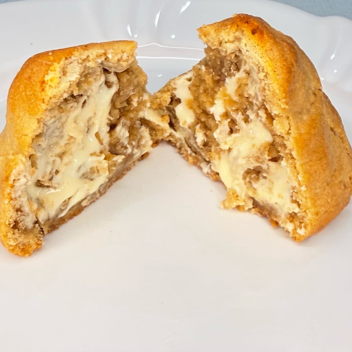 Cookie de massa Ninho com gotas de chocolate branco e recheio cremoso de brigadeiro de Ninho.