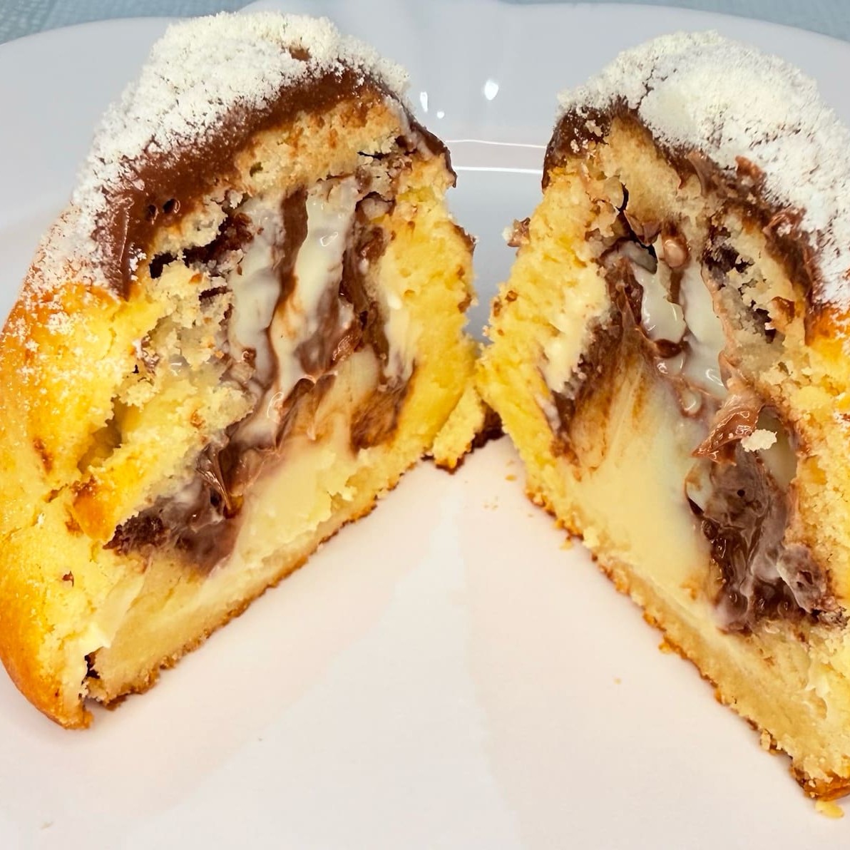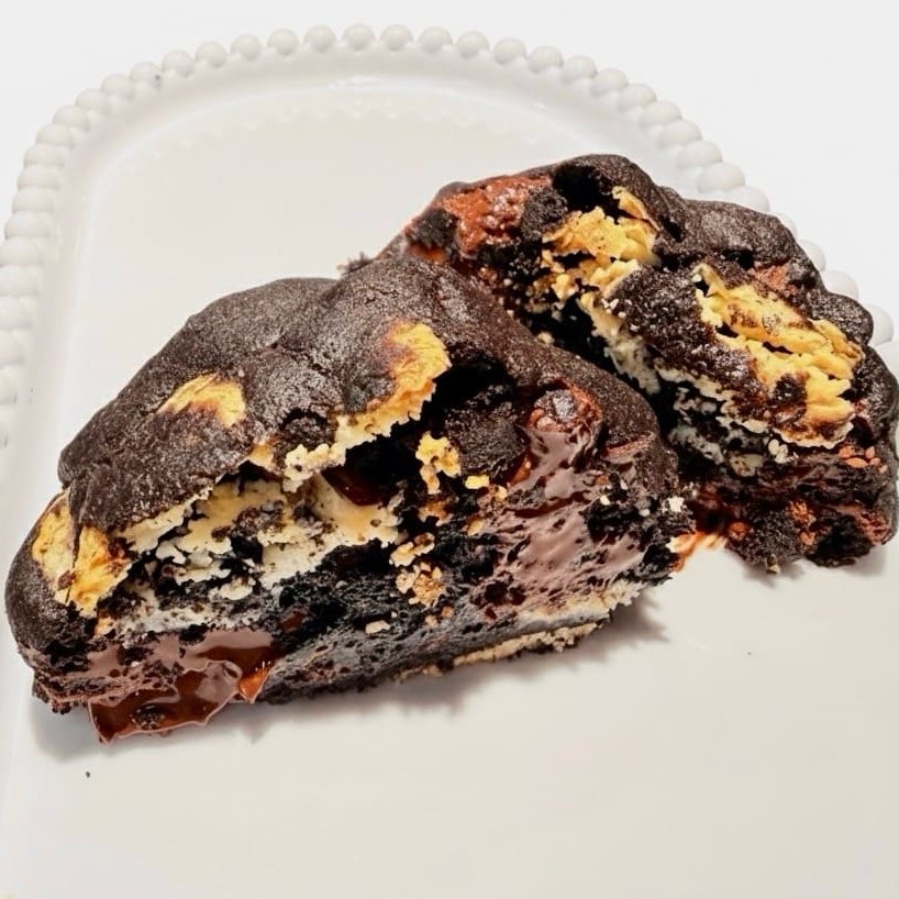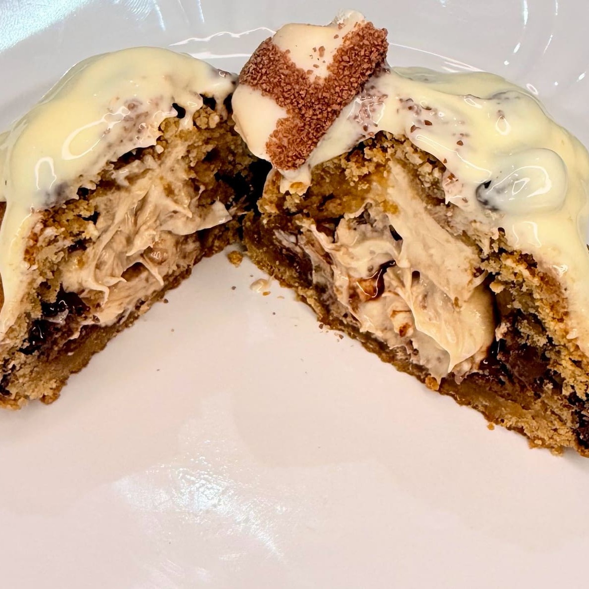 Cookie de massa Ninho com gotas de chocolate branco e recheio cremoso de brigadeiro de Ninho e Nutella.