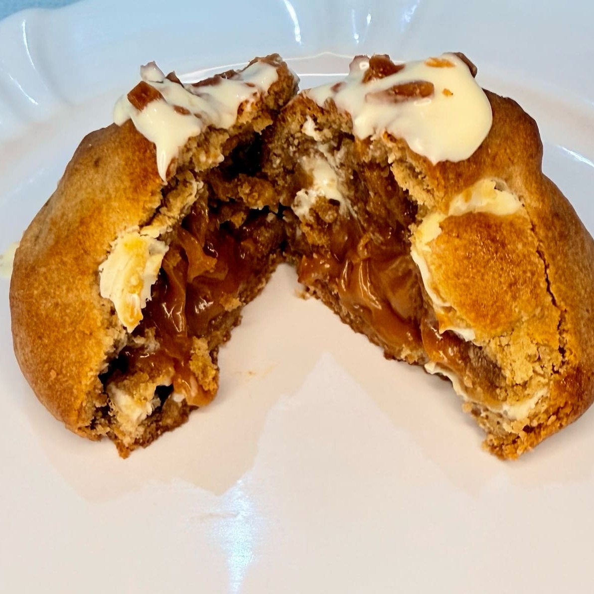 Cookie massa de baunilha com crocante de caramelo salgado e gotas de chocolate branco com recheio cremoso de brigadeiro de caramelo salgado.