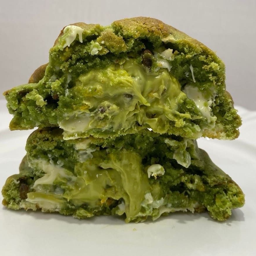 Cookie de massa de baunilha com pistache, recheio cremoso de pistache.