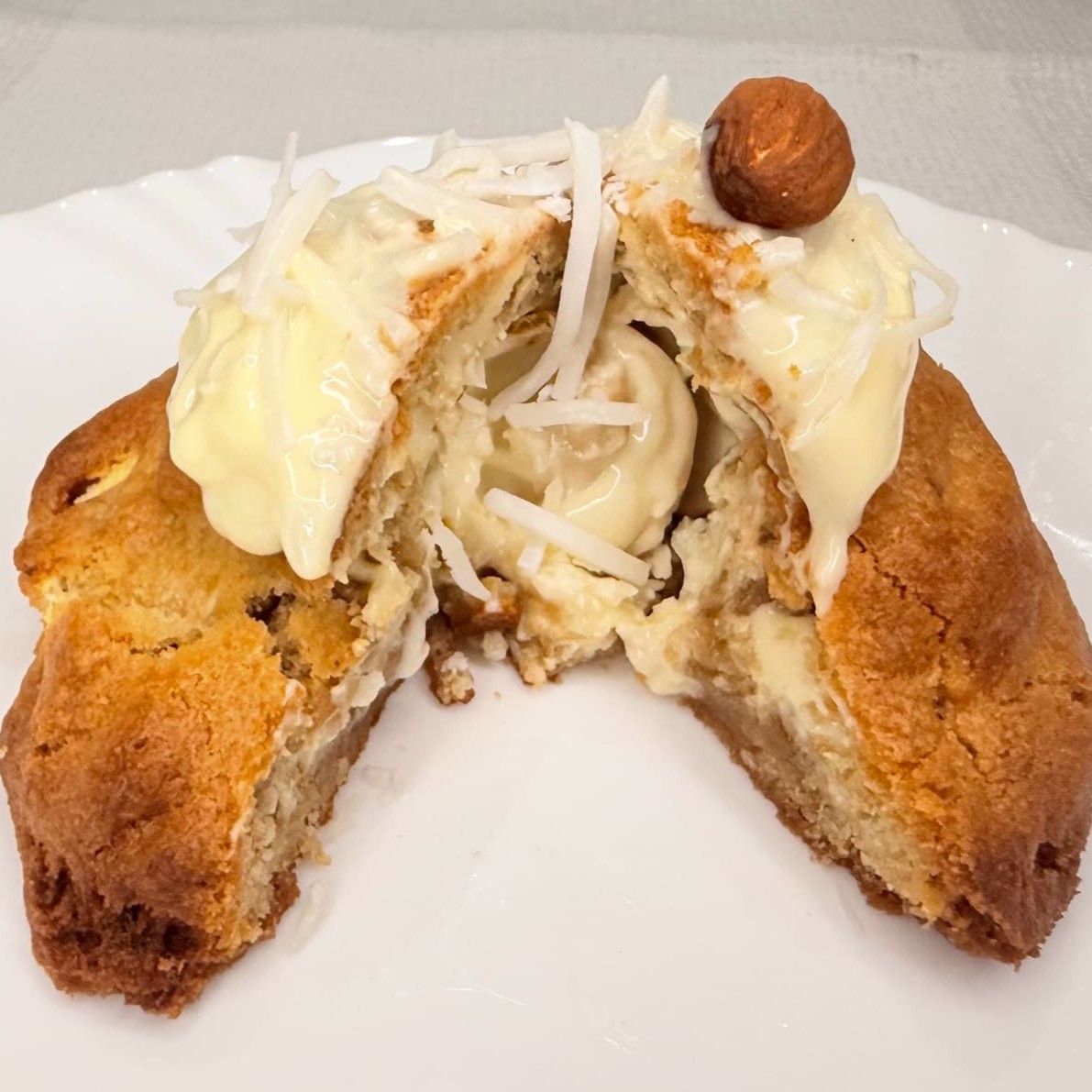 Cookie de massa de baunilha com coco, com recheio cremoso de Raffaello.