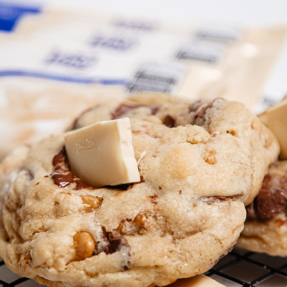 Cookie de Prestigio com Nozes Macio por dentro, levemente crocante por fora, feito com chocolate meio amargo e gotas de chocolate branco pedacinhos de nozes para um sabor irresistível! Perfeito para qualquer momento do Dia. ️ Contém glúten, leite, ovos e nozes. Pode conter traços de amendoim e outros oleaginosos.