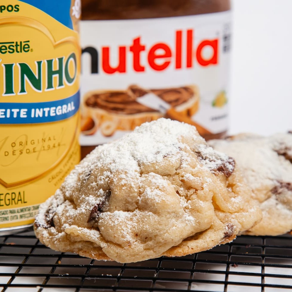 Cookie de Nutella com Ninho com Nozes Macio por dentro, levemente crocante por fora, feito com chocolate meio amargo e pedacinhos de nozes para um sabor irresistível! Perfeito para qualquer momento do Dia. ️ Contém glúten, leite, ovos e nozes. Pode conter traços de amendoim e outros oleaginosos.