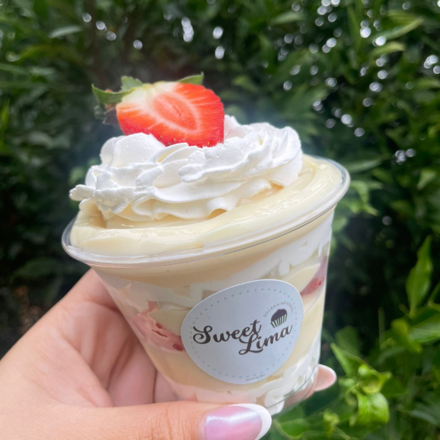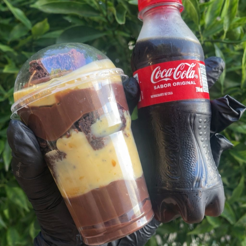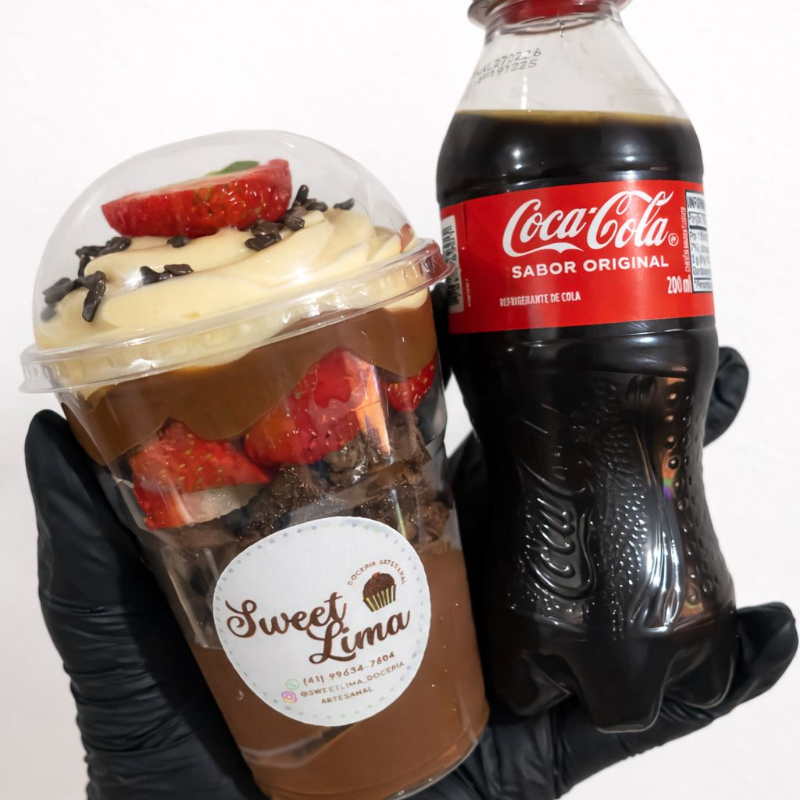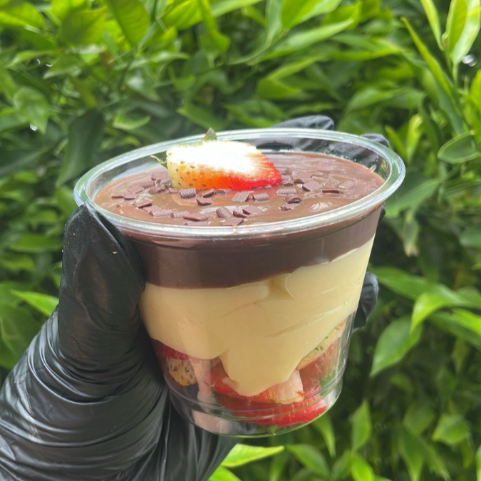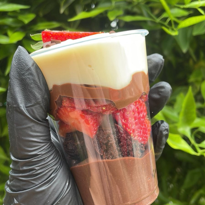 Camada generosa de creme de brigadeiro, pedaços de brownie, morangos frescos, uma camada de Nutella e Creme de Ninho.