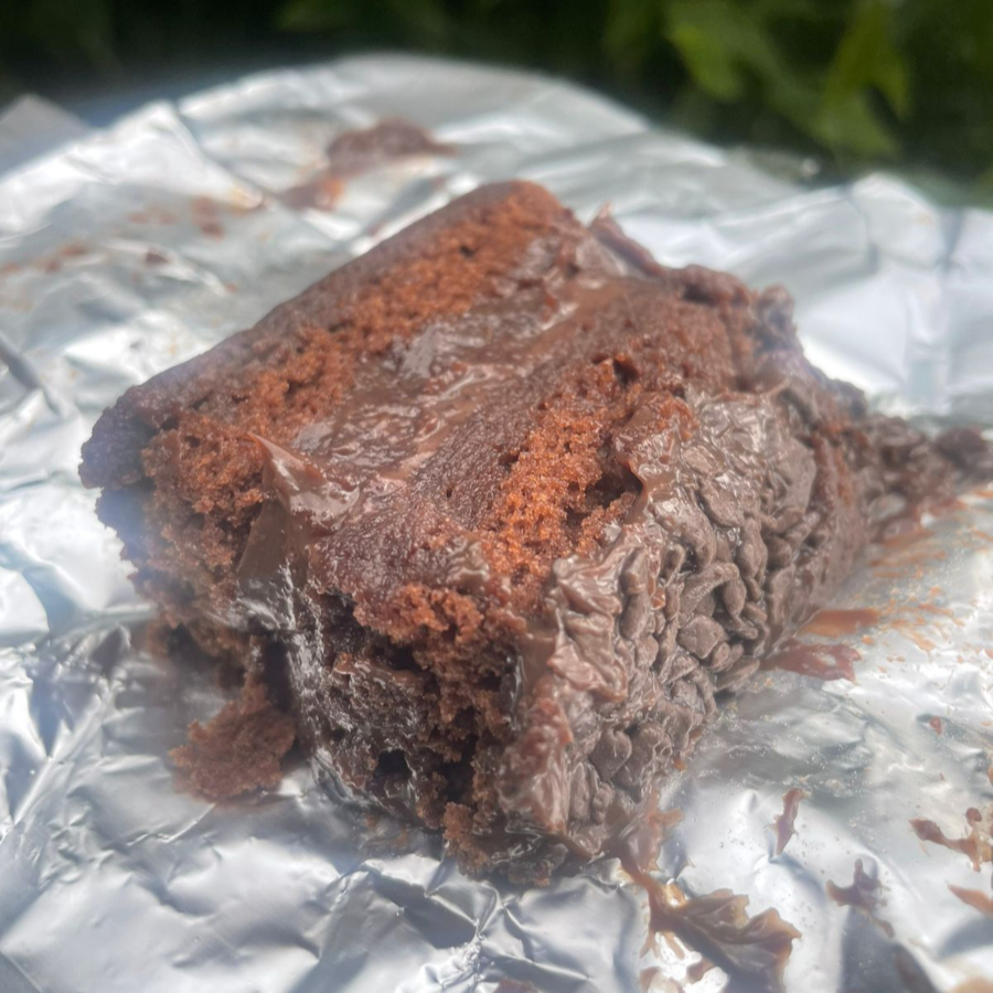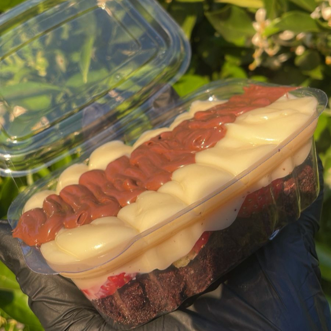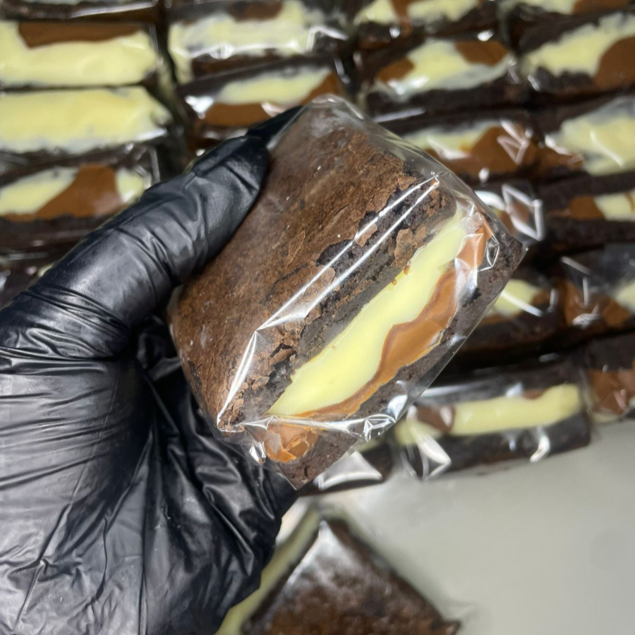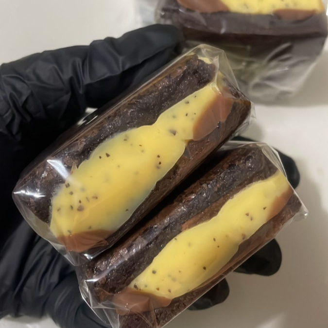 Brownie artesanal recheado com creme de maracujá e um delicioso creme de Brigadeiro.