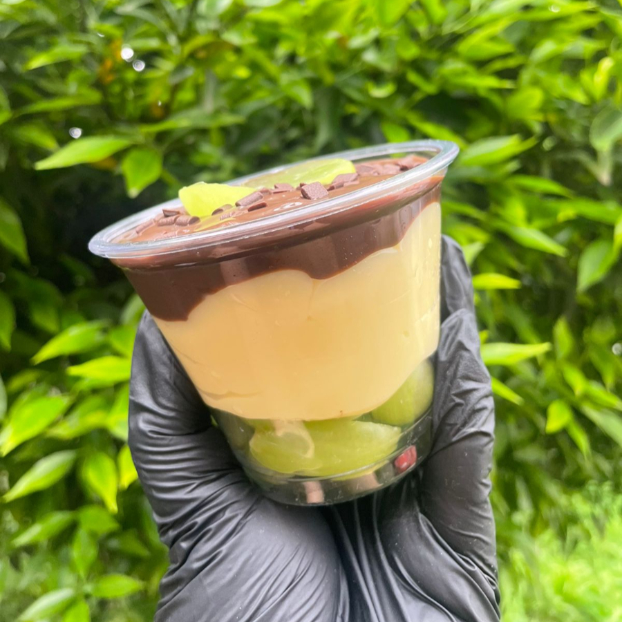 Uvas sem sementes, uma deliciosa camada de Creme de Ninho e creme de Brigadeiro ao leite e granulado de chocolate nobre.