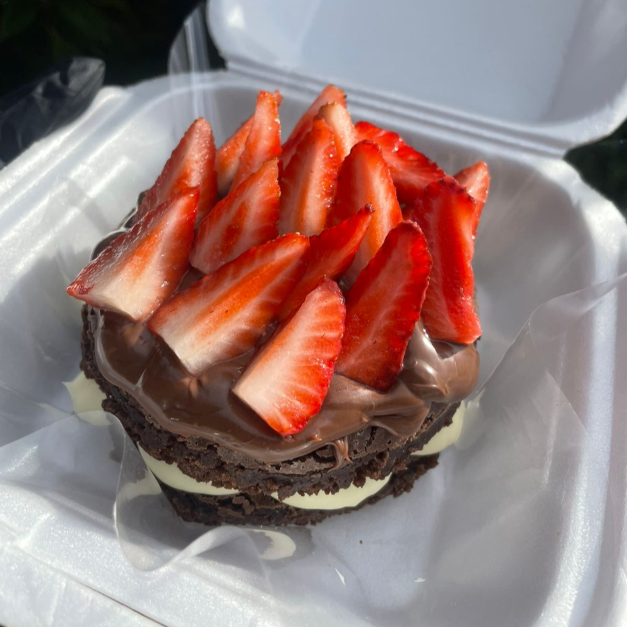 Camadas de Brownie com nosso creme de Ninho e finalizamos com Nutella e Morango.