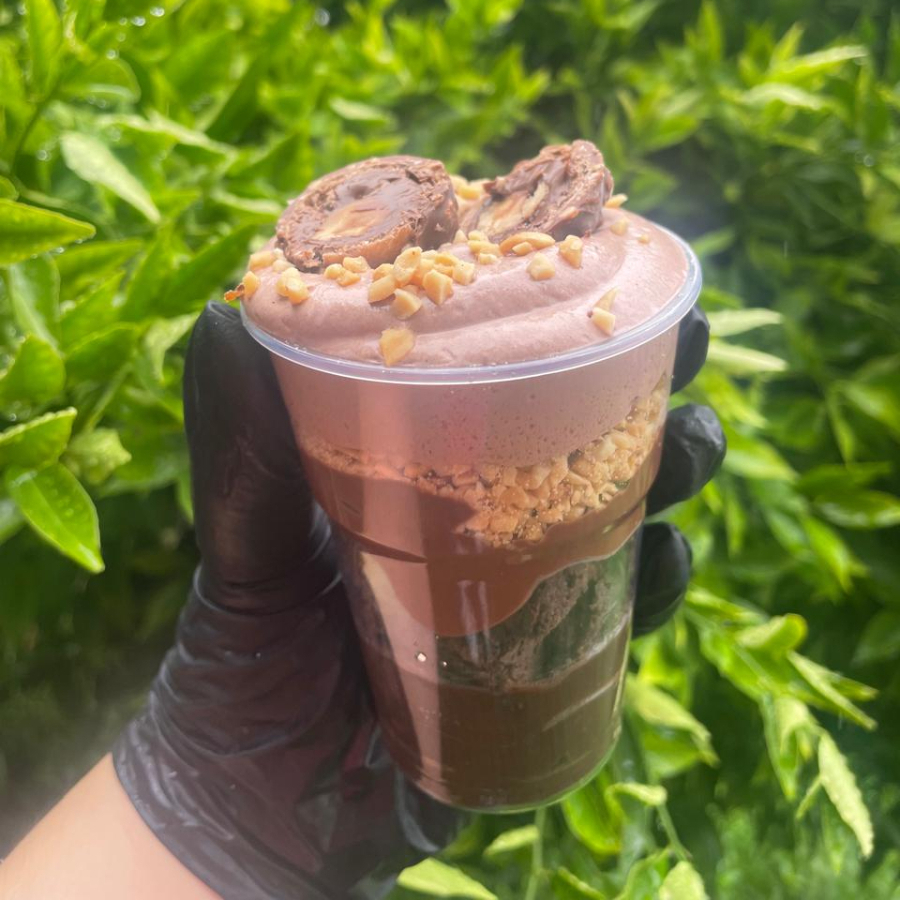 Uma Camada generosa de Brigadeiro, pedaços de brownie, uma cama de Nutella, Amendoim em granulado e finalizamos com uma camada de Mousse de Nutella e Ferrero Rocher.