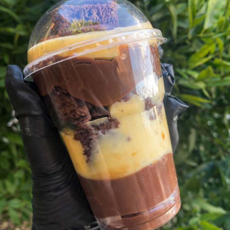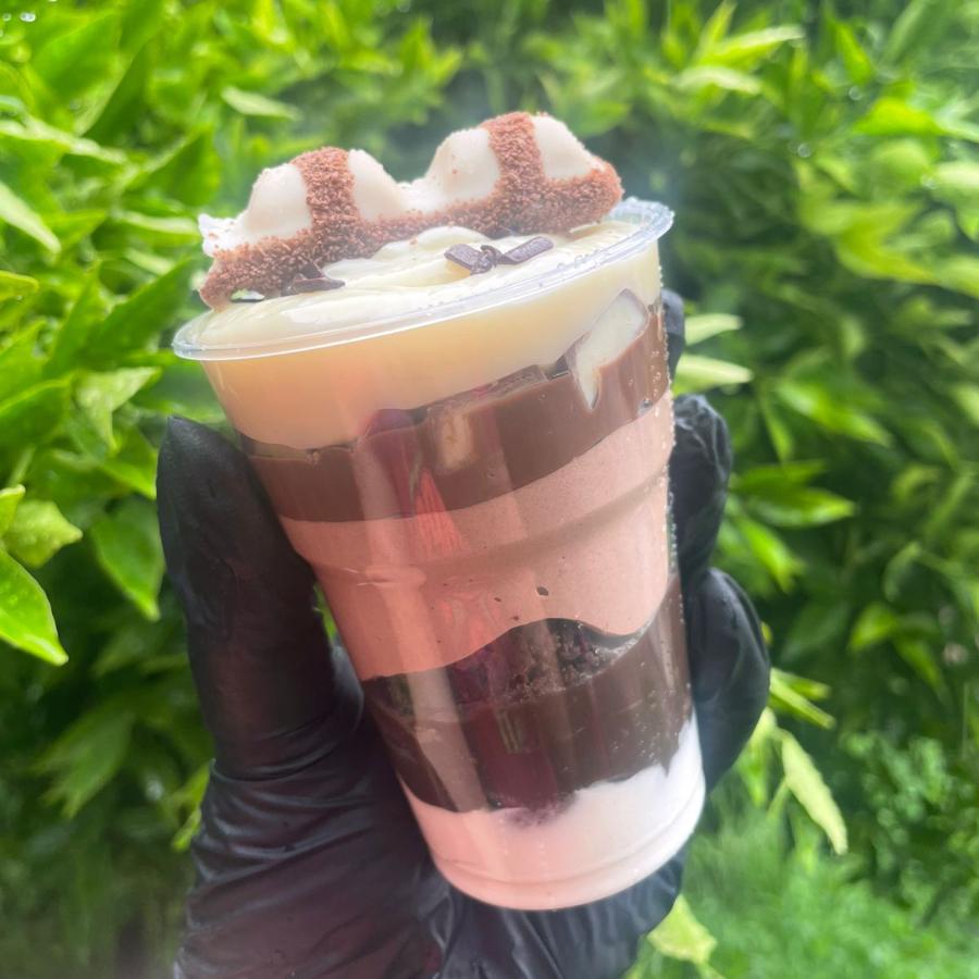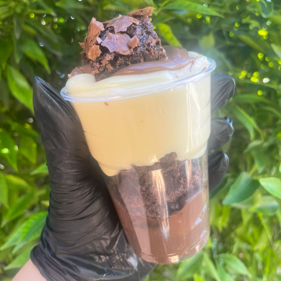 Brigadeiro gourmet Cremoso, pedaços de Brownie , uma camada do nosso Creme Branco e finalizamos com Nutella e bronwie