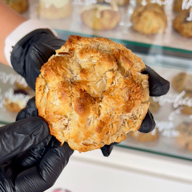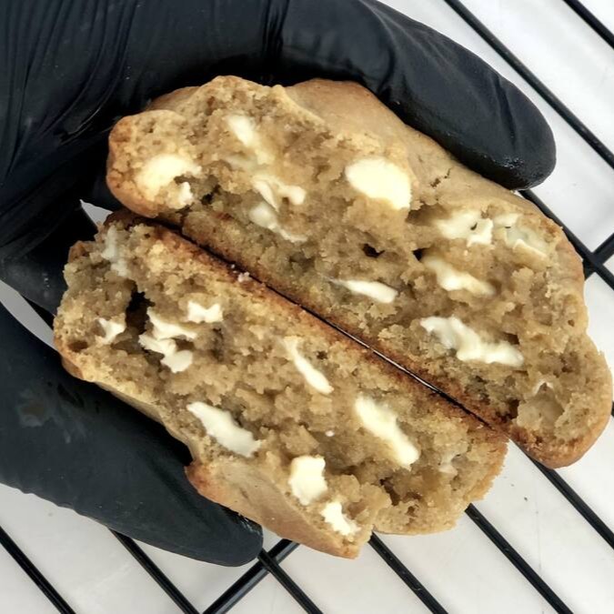 Cookie de bala baiana, a verdadeira paixão por coco! Com a massa tradicional com baunilha, chocolate branco e crocantes de caramelo, para finalizar uma camada generosa de coco em flocos.