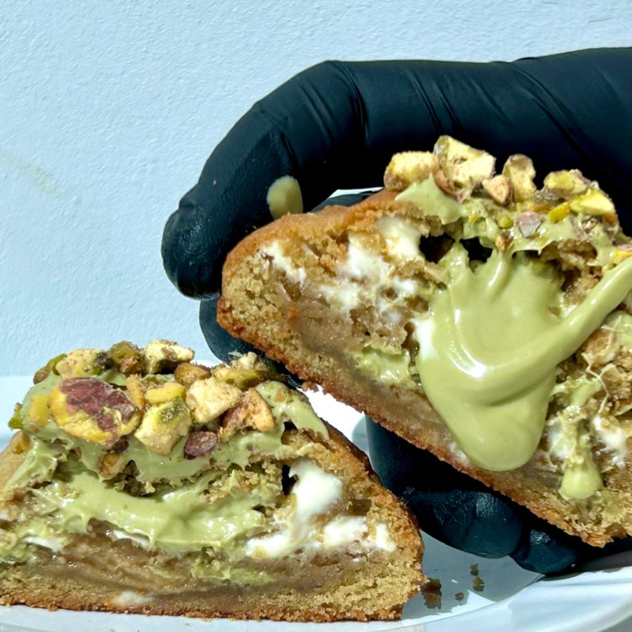 Nosso cookie de pistache é sensacional, com nossa massa tradicional com chocolate branco, no recheio um delicioso creme de pistache. Finalizamos com nosso creme e nossa farofa especial de pistache!