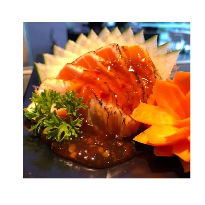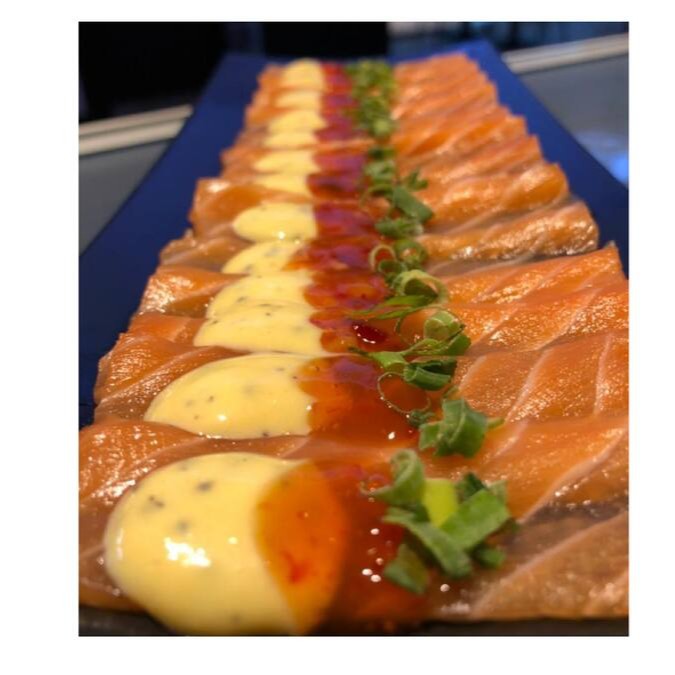 5 fatias de salmão, 5 fatias de salmão selado com tarê e crispy de couve, 5 fatias de salmão com sweet chili, 5 fatias de salmão com molho de ostra e crispy de alho poró.