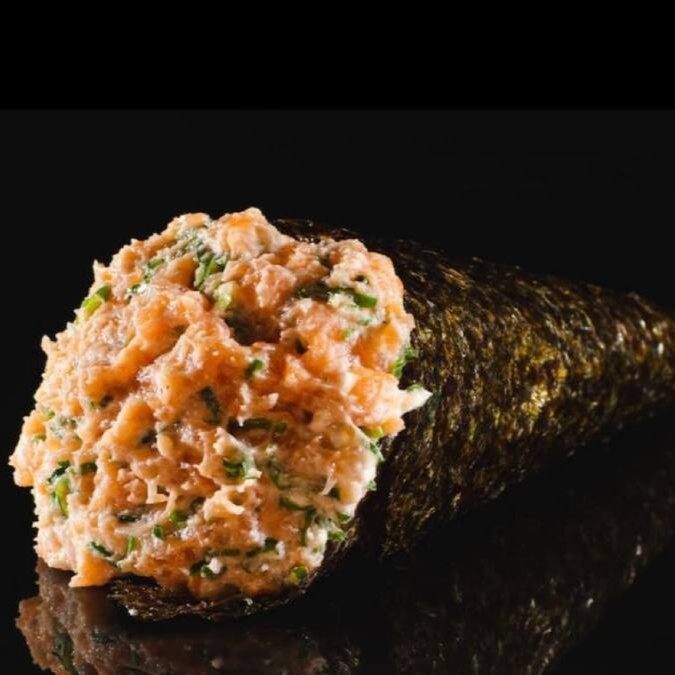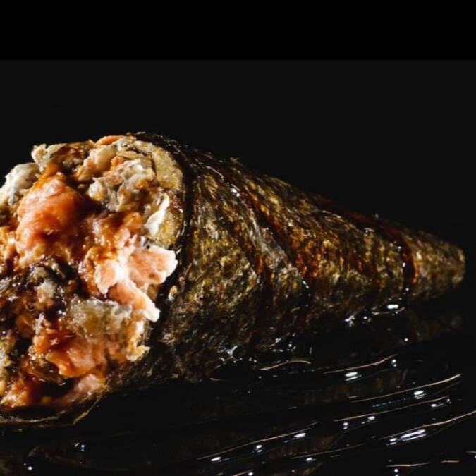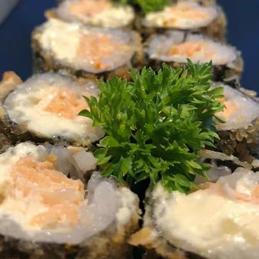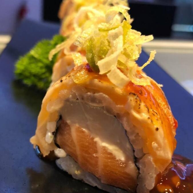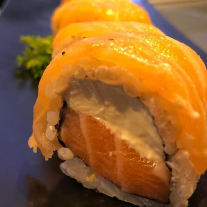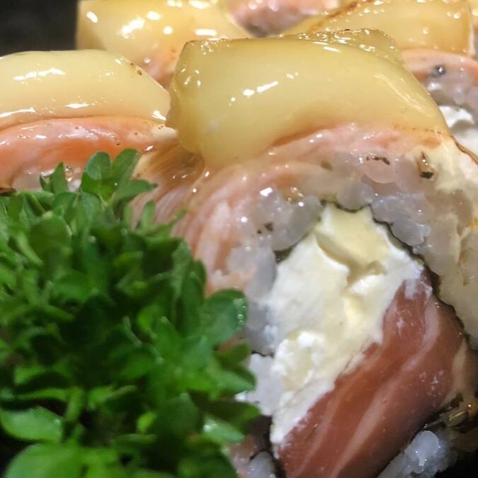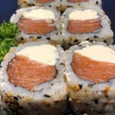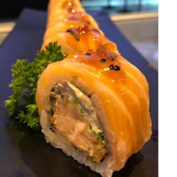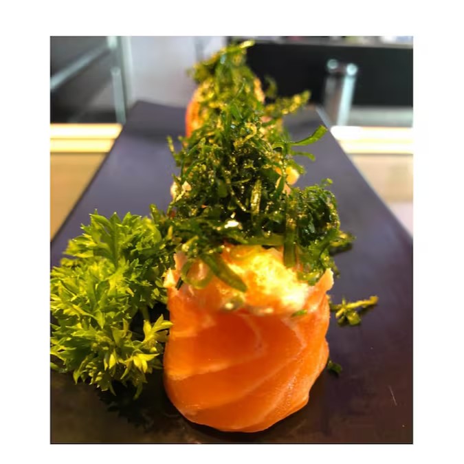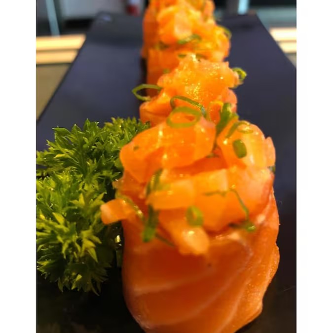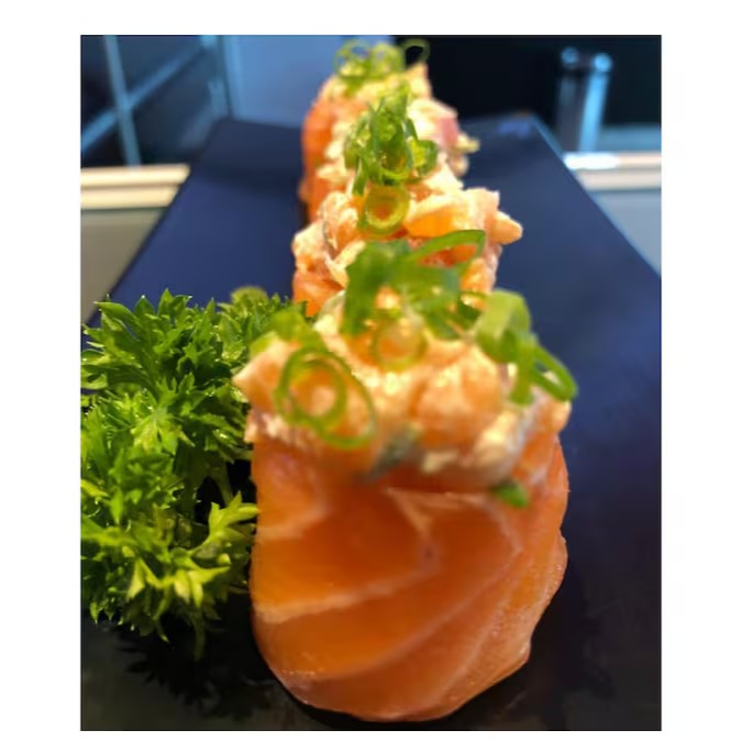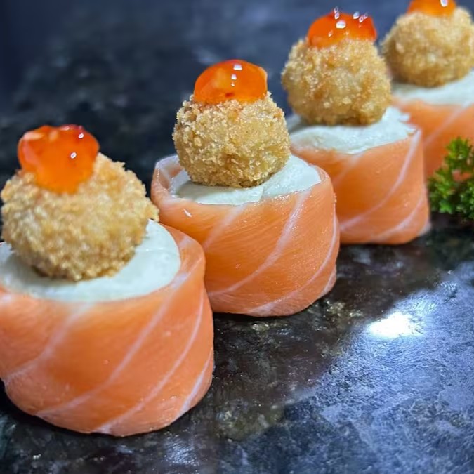 Salmão e cream cheese, finalizado com sweet chili e crispy de alho poró.