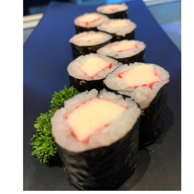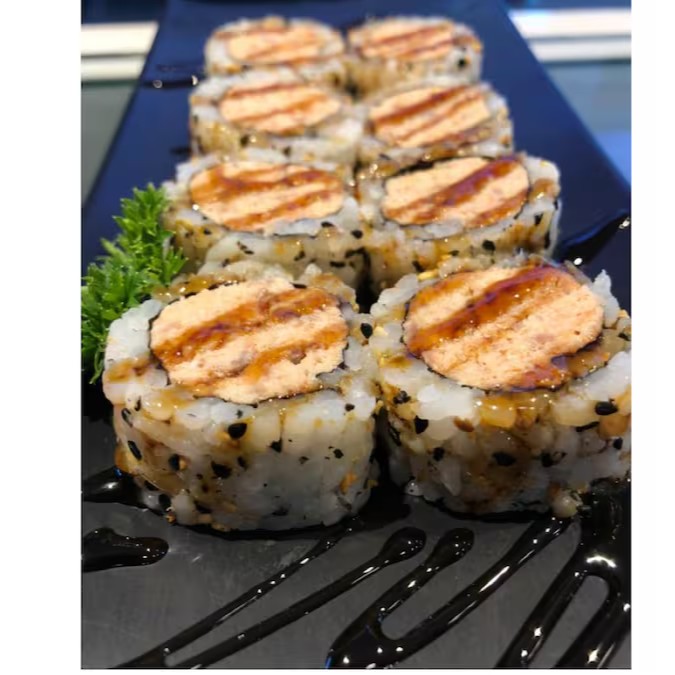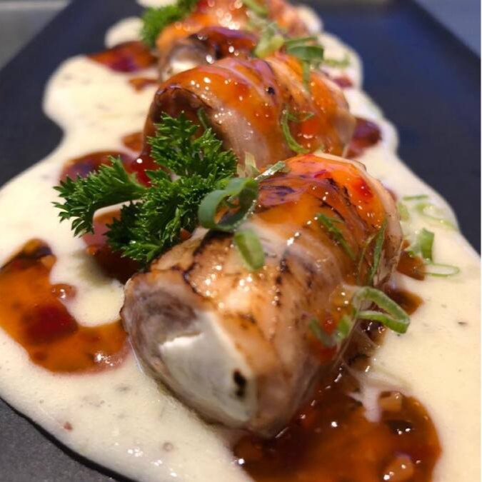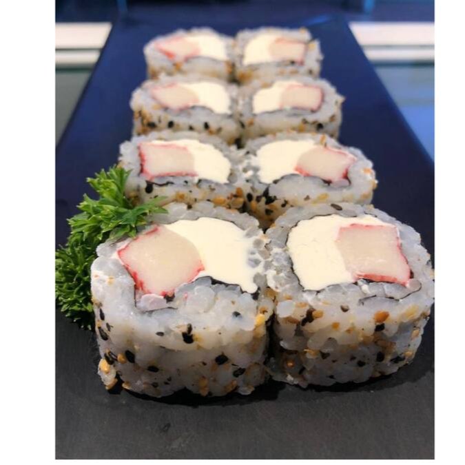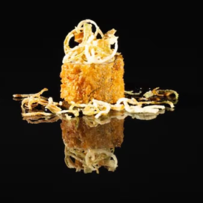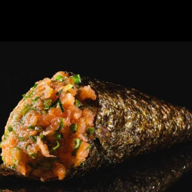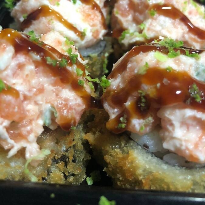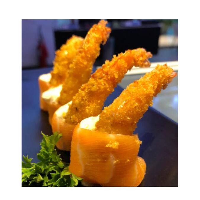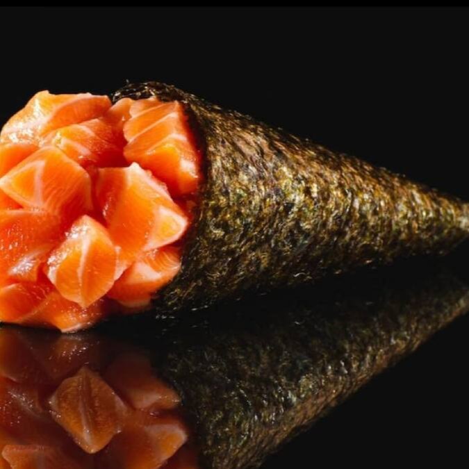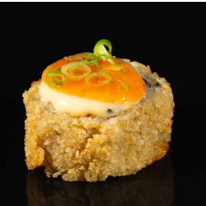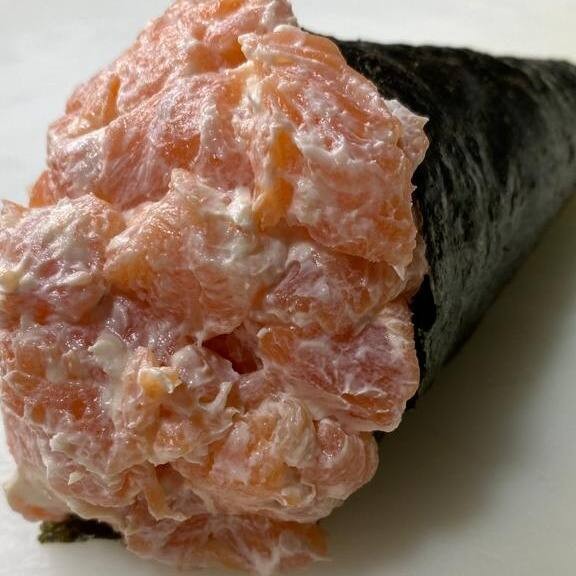 Salmão e cream cheese, finalizado com sweet chili e crispy de alho poró.