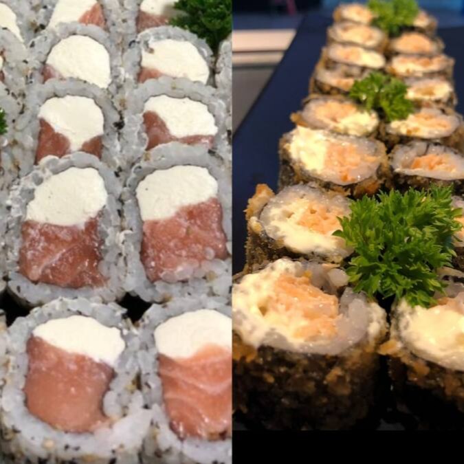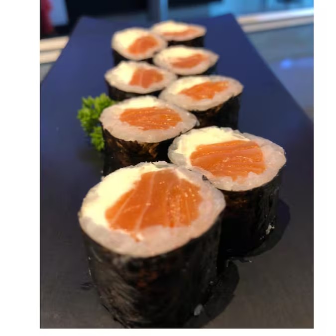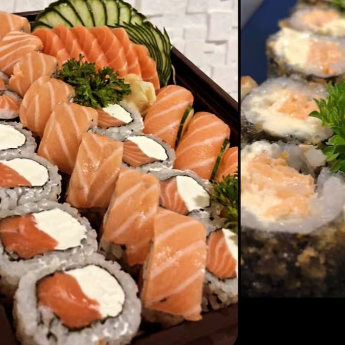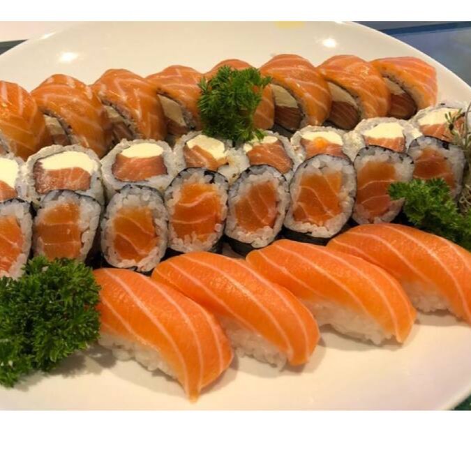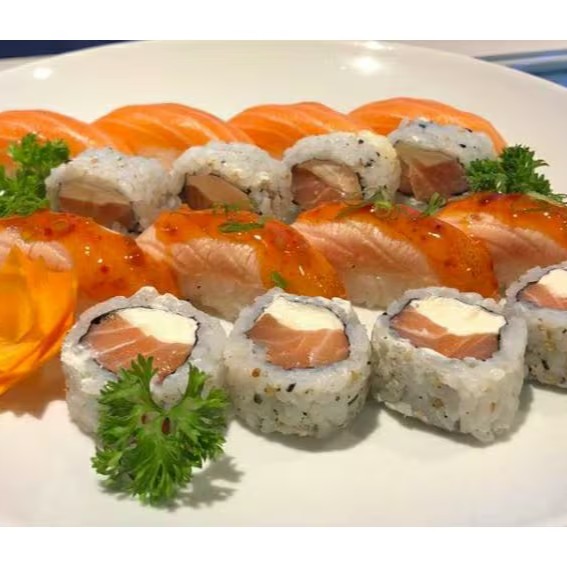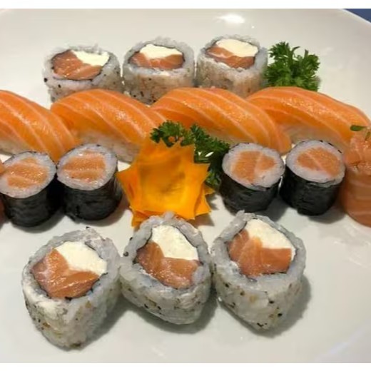8 uramaki filadélfia, 8 uramaki filadélfia especial, 8 shake maki, 4 niguiri de salmão.