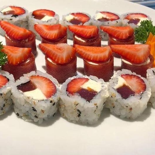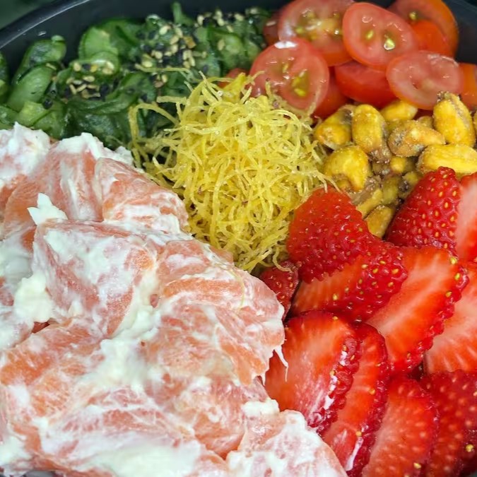 Base arroz de sushi, salmão com cream cheese, morango, milho peruano, sunomono, tomate cereja e crispy de batata doce.