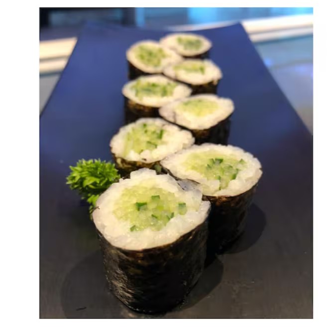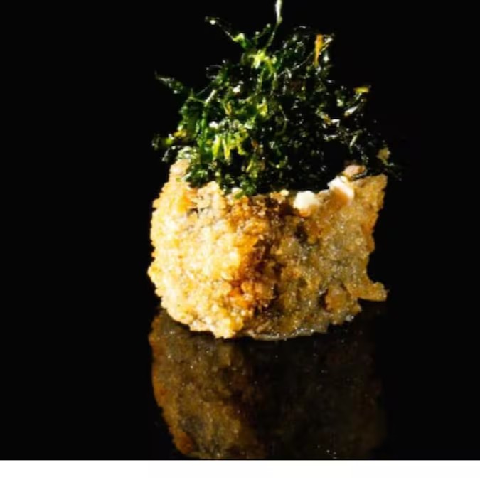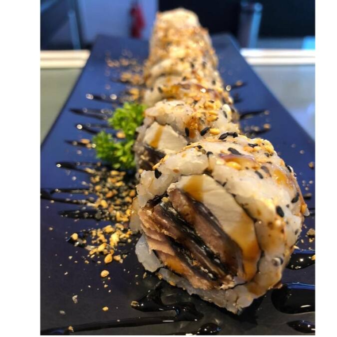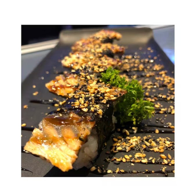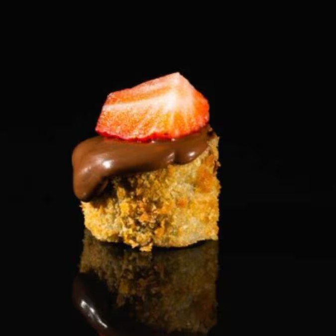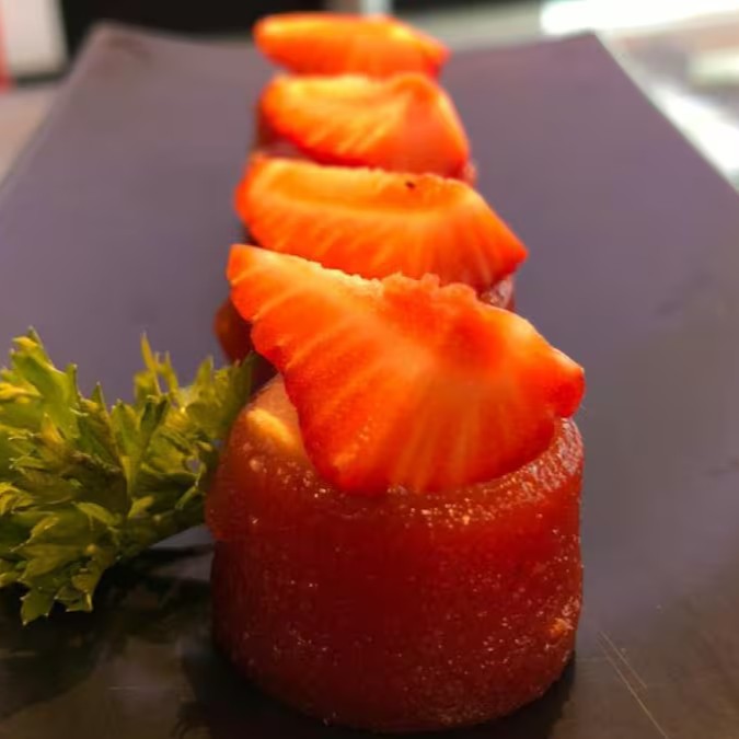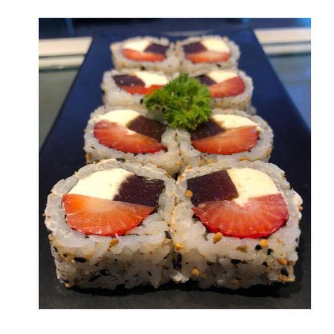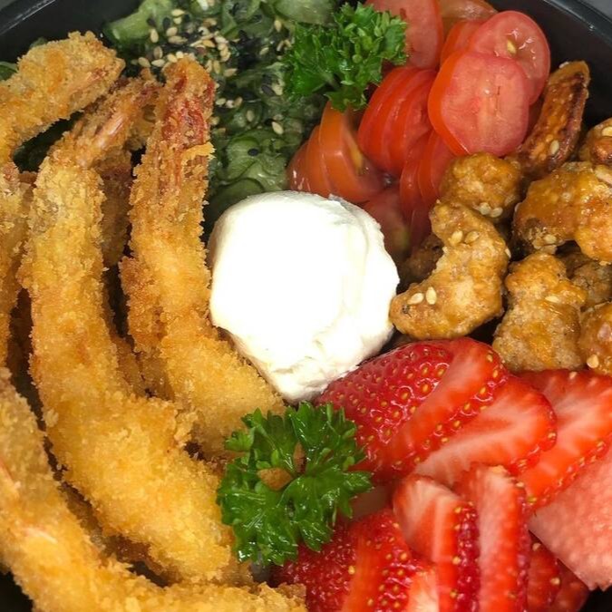 Base arroz de sushi, camarão à milanesa, sunomono, tomate cereja, castanha de caju caramelizada, morango e cream cheese.