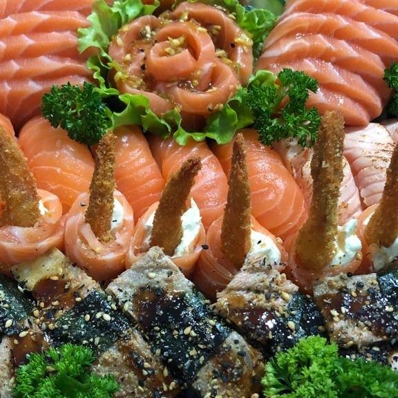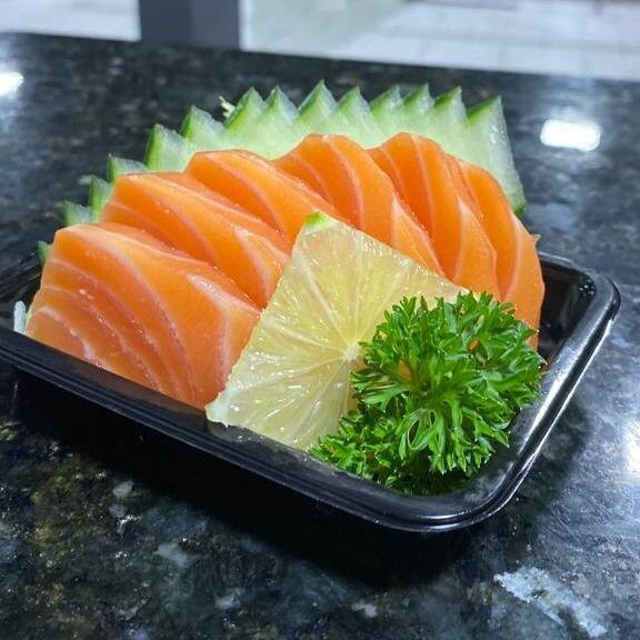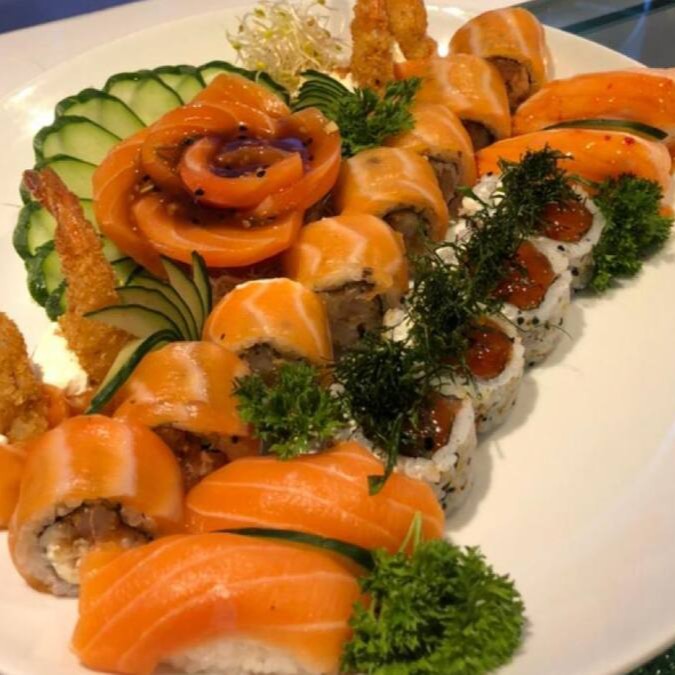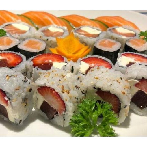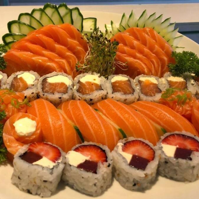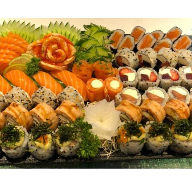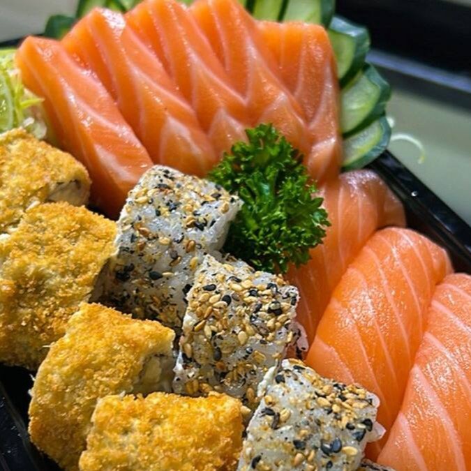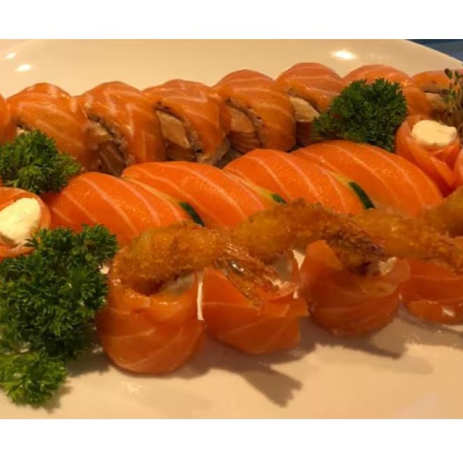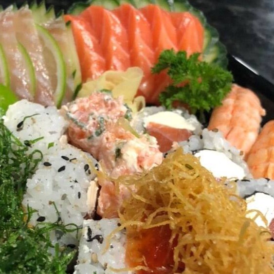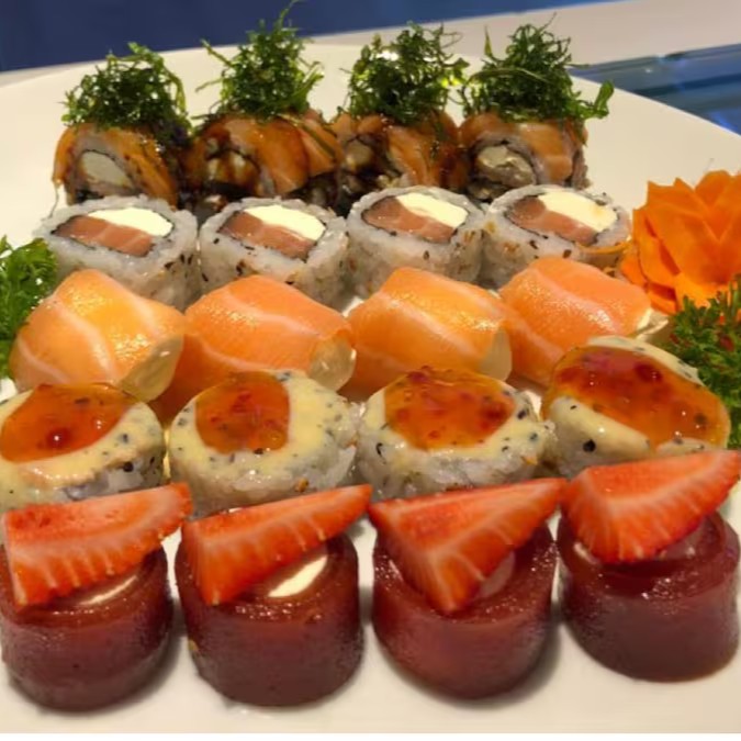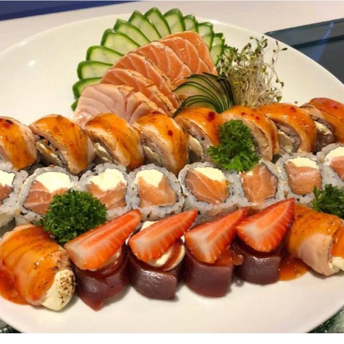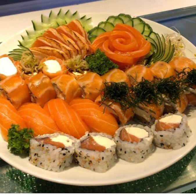 5 sashimi de salmão, 5 sashimi de tilápia com limão, 2 niguiri de camarão, 2 niguiri de tilápia com limão, 2 Jow Filadélfia, 2 Jow de batata doce, 8uramaki Filadélfia, 4 uramaki grelhado especial.