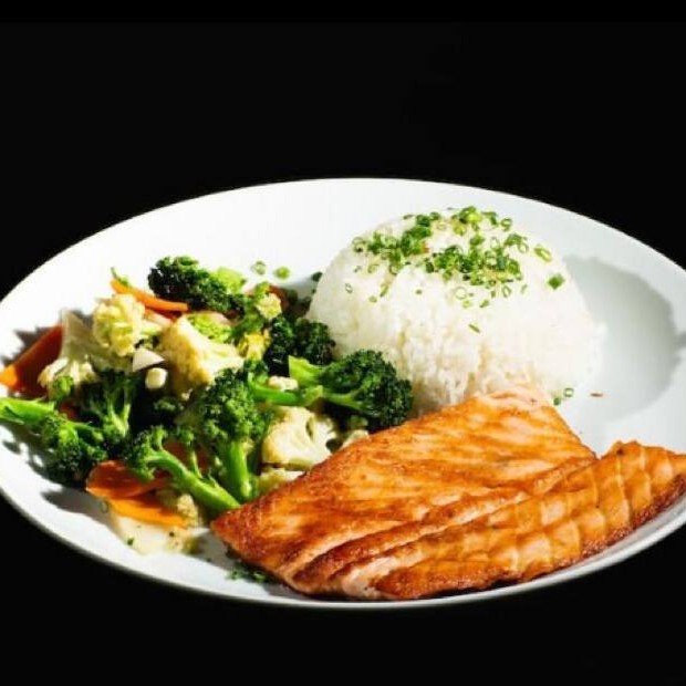 Salmão grelhado e legumes na manteiga, acompanha Gohan.