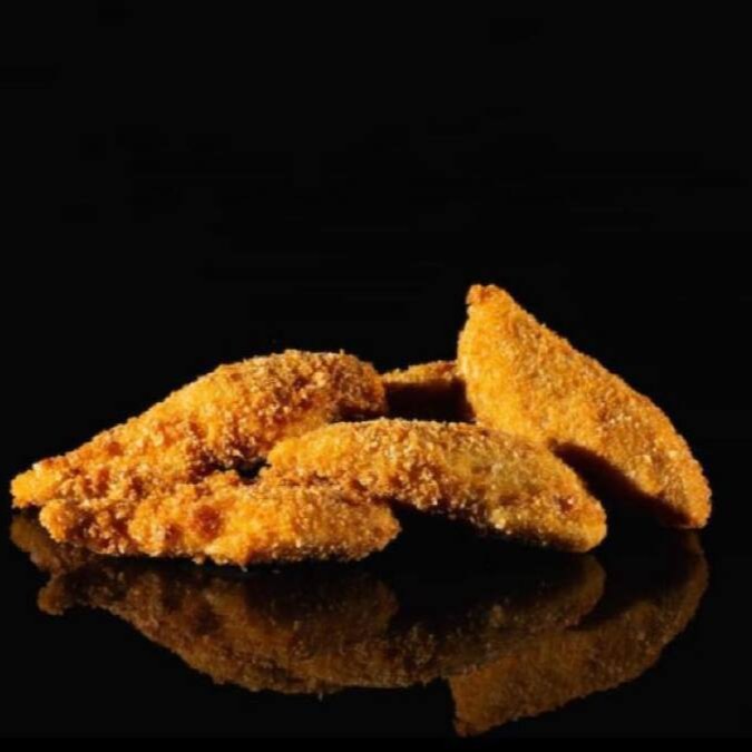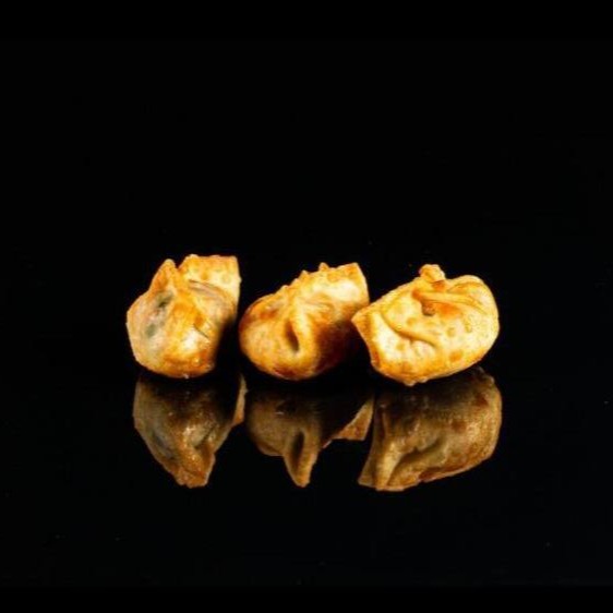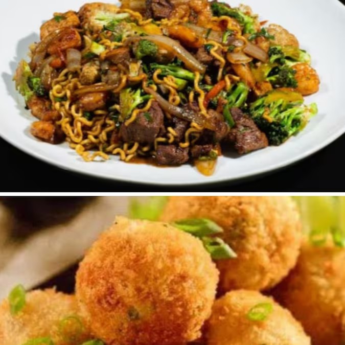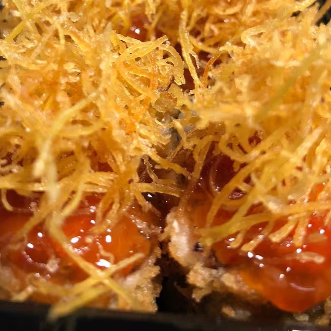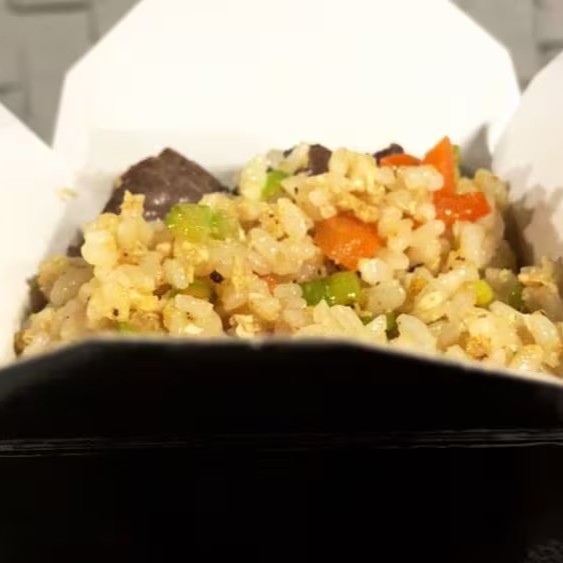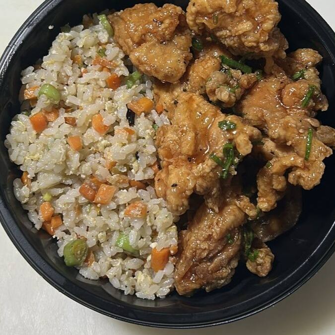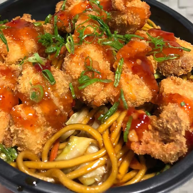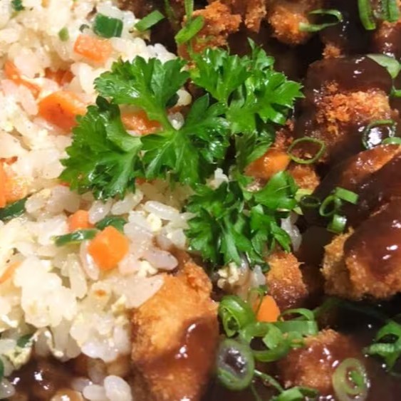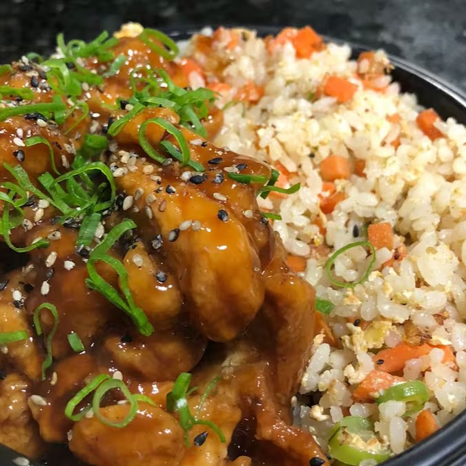 Yakimeshi coberto com pedaços de frango crocante, salpicado com cebolinha e irresistível molho oriental.