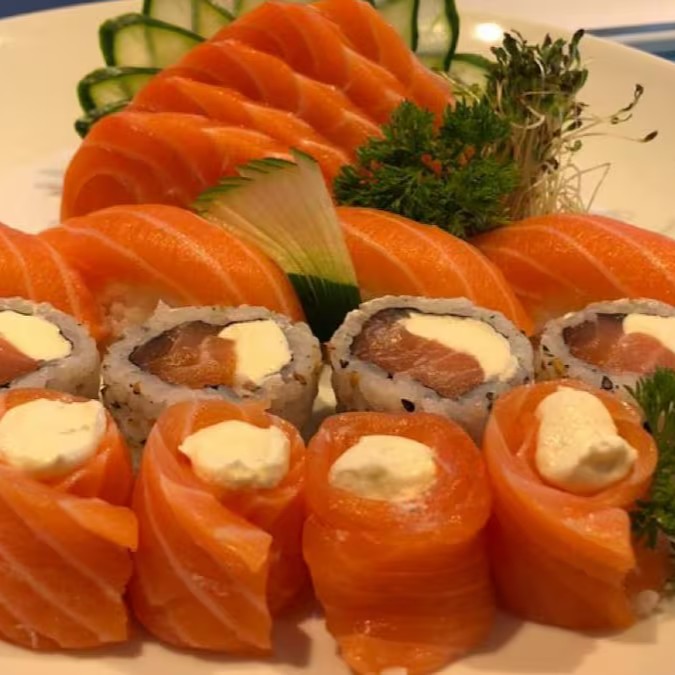 5 sashimi de salmão, 4 uramaki filadélfia, 4 niguiri de salmão, 4 jow com cream cheese (sem arroz).