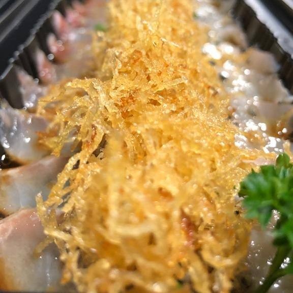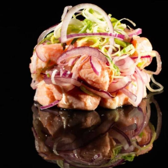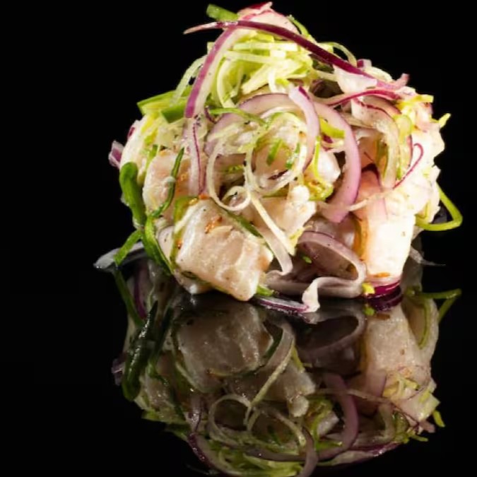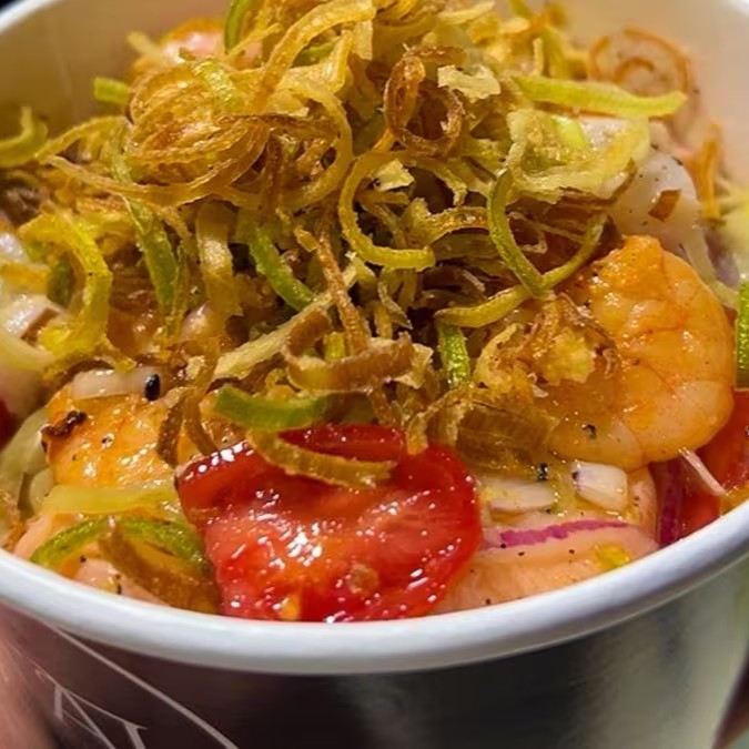 Camarão, salmão e tilápia marinados no limão, com alho poró, cebola roxa e tomate cereja, finalizado com crispy de alho poró.
